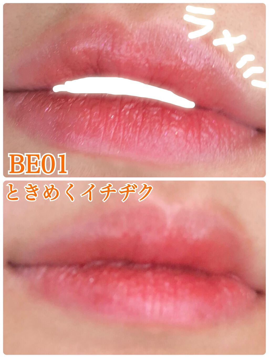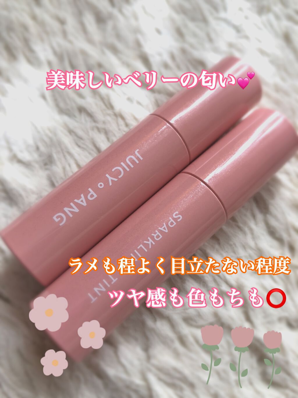 中身のラメ量はないか、とても少しでした! スウォッチのときはベビーピンクでしたが、私の唇ではビビットピンクでした。 塗ってから、無色→ベビーピンク→ビビットピンクと時間経過で色が濃くなっていく&青みになっていく印象です🌸 薄く塗るのが⭕️なようです! 保湿感はあるし、落ちにくいのでこの色が似合う方にはおすすめですが、スウォッチで気付きにくい部分ですので注意が必要かもしれません…! 一番最初のスウォッチと、二度目以降のスウォッチでも色が少し違く見えたのでもしかしたら、吹き付けの部分がなくなればスウォッチでもそのものの色味がみれるかもしれません! 店頭のスウォッチで吹き付けが取れていなかったら何度か手にスウォッチしてみてもいいかもしれません…!