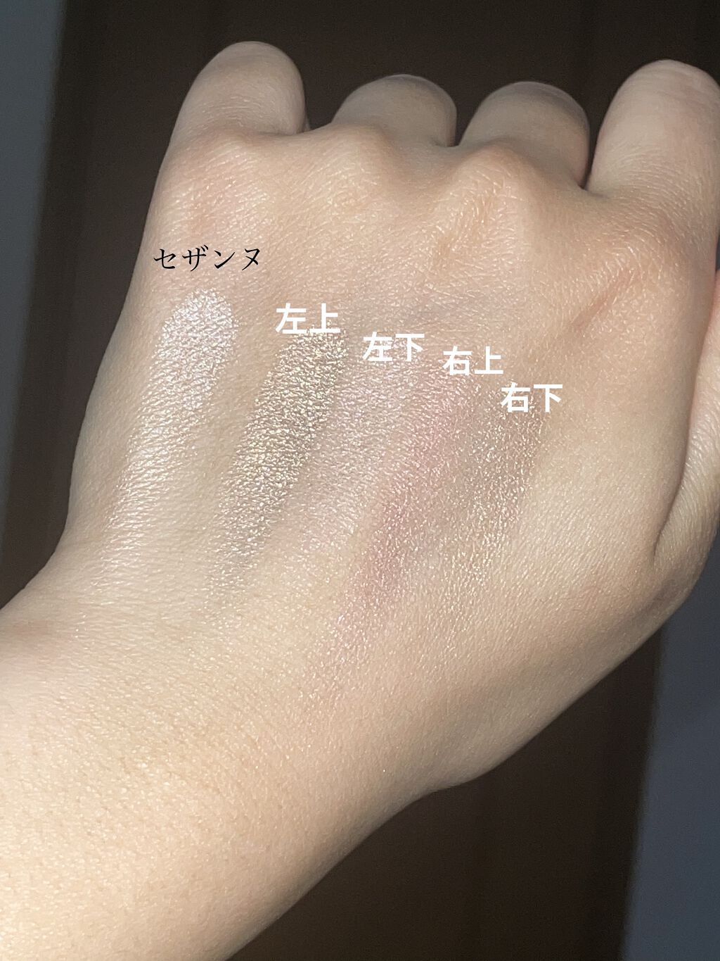 しっかりとプレストしてあって、ぎっしりラメが詰まってる…😭💕 最高に綺麗な艶ができる! 比較として、セザンヌの有名ハイライトよりかはサラサラに感じて、Macの有名ハイライトよりかはしっとりしてる感じがします! 口コミで「上品」ってよく見かけましたが、その意味がよーく分かる!ほんと上品! 顔がフワッと明るくなって水分をいっぱい含んだうるうるの肌にみえる! きっと持ってる人が多そうなセザンヌのパールグロウハイライト01と比べると、艶というよりかはラメっぽいかなという印象。 ただ少しだけ気になったのは、やっぱりベースの色の濃さ。 左上はシアー、左下はシマー、右2つはメタリックと質感も違っています。 私のおすすめは左上と左下混ぜる→頬、鼻筋、高く見せたい所 右上→チークとして 左下→アイシャドウ、涙袋に塗るとそれぞれの良さが発揮されるんじゃないかなと思います!ご参考までに!