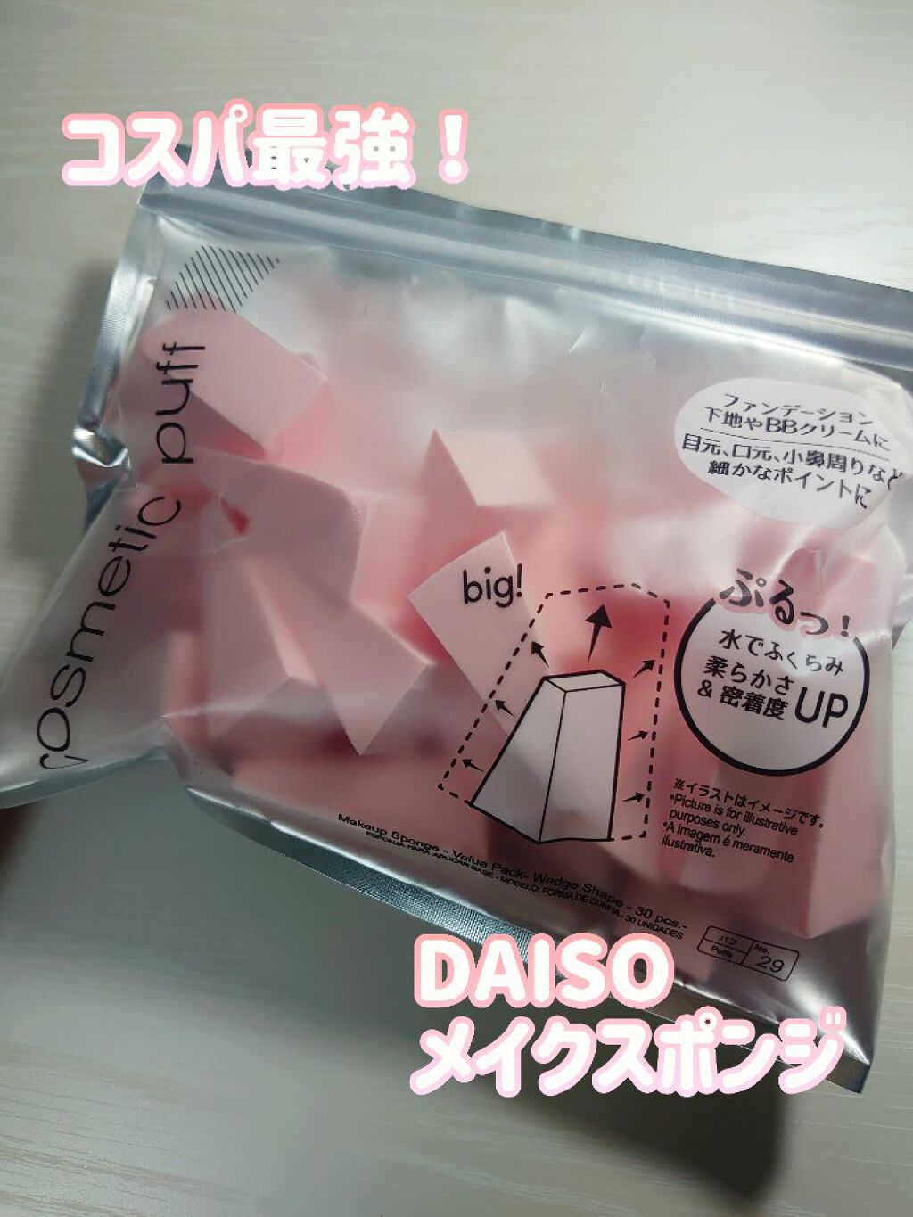DAISO メイクアップスポンジ バリューパックウェッジ型30個 ¥11030個も入って110円とは…ダイソー様々です🙏🏻🩷指よりパフを使う事で、リキッドファンデをムラなく伸ばす事が出来ます!洗えば繰り返し使用出来ますが、衛生面を考えて定期的...