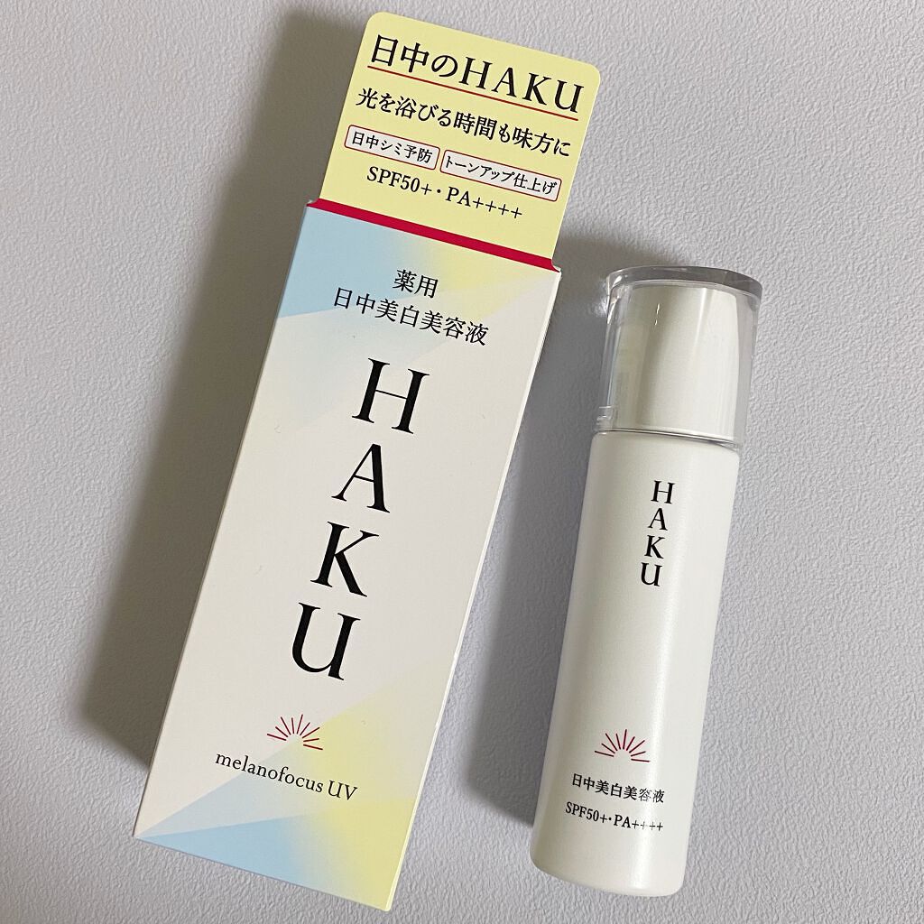 - 販売名「メラノフォーカスUV」 SPF50+・PA++++ 日中のHAKU。光を浴びる時間も味方に、日中だからできる美白ケアのアプローチ。 シミ予防研究の先端技術を搭載し、日中ならではの美白ケアを可能にした、薬用日中美白美容液です。光を浴びる時間も味方にして、明るく透明感のある肌に導きます。 ○2種の美白有効成分を肌の奥まで届け効かせる。 ○日中の肌環境に着目し、Wデイエフェクターを配合。うるおいを与え届ける。 〇ファインレッドパールαが効果的に光を放ち、シミや色ムラを目立たせない。トーンアップ効果で、明るく透明感のある仕上がり。 〇みずみずしい美容液がスーッとなじむ。化粧下地としても使える。 ○無香料・アレルギーテスト済み・ニキビのもとになりにくい処方。 (全てのかたにアレルギーが起きない、ニキビができないというわけではありません)。