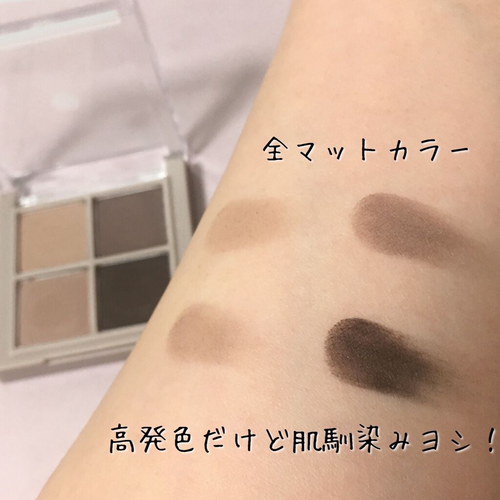 100円で9色のアイパレットは凄いです。 黒い枠の背が高く、指でアイシャドウを取ろうとすると爪が引っ掛かり取りにくいのが難点。 発色はまずます。結構薄づきです。色味のせいかイエベ秋の私には物足りなさな発色。 大絶賛まではいかなかったけど、普通に使えるパレットです。