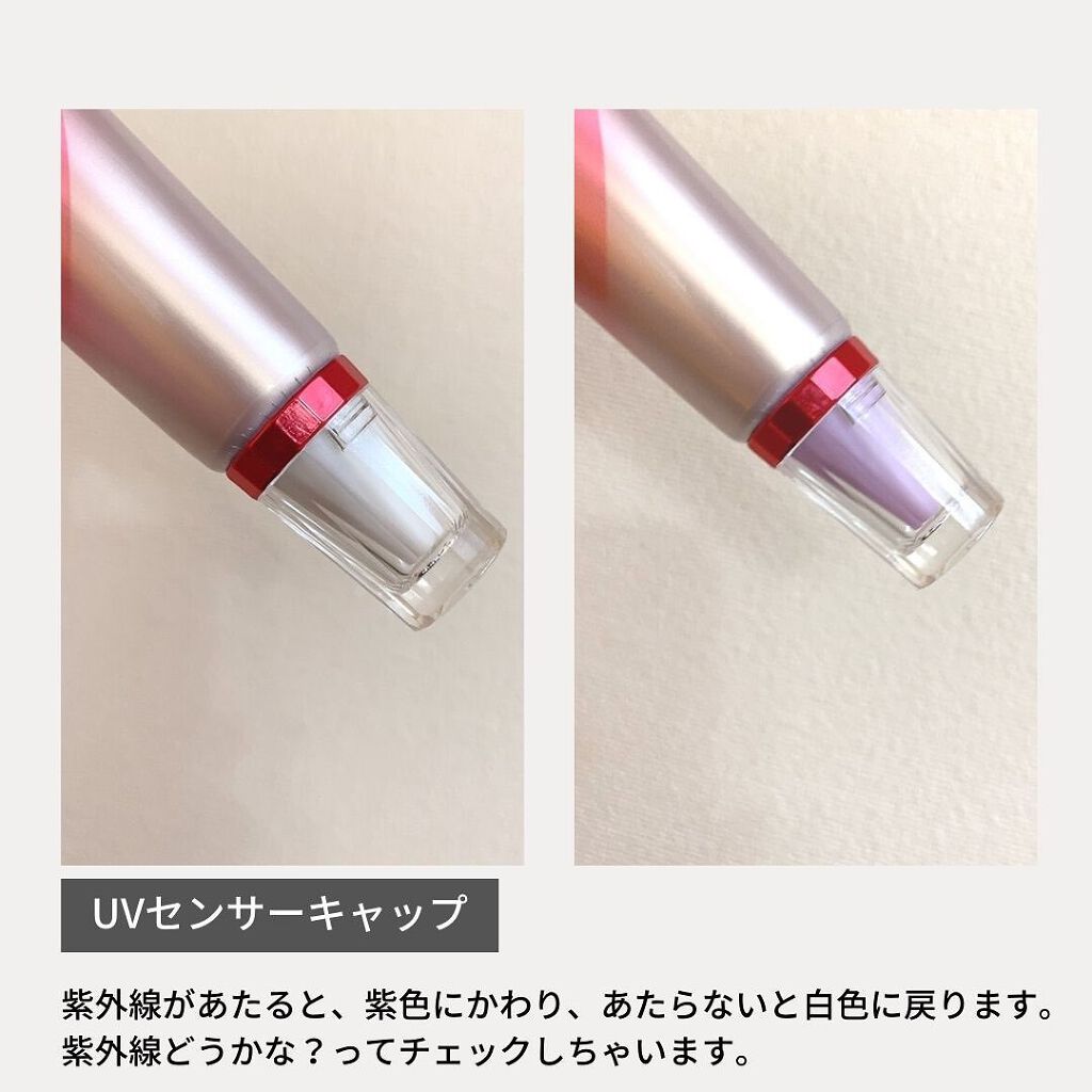 光をコントロールして肌を美しく、ワントーン明るい印象に仕上げる。 肌の奥まで侵入する「Deep紫外線」までしっかりカットするので、メイクアップ後も高いUVケアを実現。 紫外線にあたるとキャップが紫色に変化する事を知りました!自宅でも試したのですが、屋内の窓際でも鮮やかな紫に!!