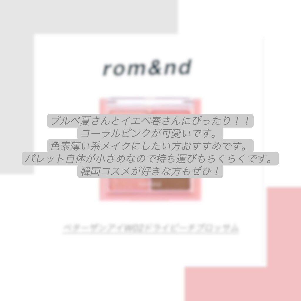 (rom&nd);#ベターザンアイズミルクシリーズ#W02DriedPeachBlossom※気軽にコメントしてください〜色素薄い系韓国メイク〜①目全体にブラシで一番うすい色を塗る②目尻だけ濃いピンクの色を指がチップで塗る③目頭と目尻にうっす...