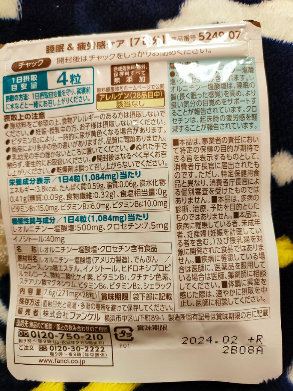 - 【機能性表示食品】朝起きた時から疲れを感じている方に。 毎日頑張る現代人には、睡眠の質を下げる要因が増えています。快活な1日のスタートのためにも、質のよい睡眠が大切です。 ファンケルの機能性表示食品「睡眠&疲労感ケア」 は、睡眠の質を高め、起床時の疲労感を軽減することが報告されたサプリメントです。 【1日の摂取目安】 4粒 【機能性関与成分/1日4粒当たり】 L-オルニチンー塩酸塩:500mg、クロセチン:7.5mg 届出表示:本品にはL-オルニチン一塩酸塩・クロセチンが含まれます。L-オルニチン一塩酸塩は、睡眠の質(長く眠った感覚)を高め、より良い気分の目覚めをサポートすることが報告されています。 クロセチンは、起床時の疲労感を軽減することが報告されています。 【その他の栄養成分/1日4粒当たり】 ビタミンB1:15.0mg、ビタミンB2:6.0mg、ビタミンB6:10.0mg 【機能性表示食品についてのご注意】 ※本品は、特定保健用食品と異なり、消費者庁長官による個別審査を受けたものではありません。 ※疾病の診断、治療、予防を目的としたものではありません。 ※食生活は、主食、主菜、副菜を基本に、食事のバランスを。 【原材料名】 L-オルニチンー塩酸塩(アメリカ製造)、でんぷん/セルロース、ショ糖エステル、イノシトール、ヒドロキシプロピルセルロース、微粒二酸化ケイ素、ビタミンB1、クチナシ色素、ステアリン酸マグネシウム、ビタミンB6、ビタミンB2、シェラック 【アレルゲン(28品目中)】 該当なし 【ご注意】 ※妊娠・授乳中の方、お子様はお召し上がりにならないでください。