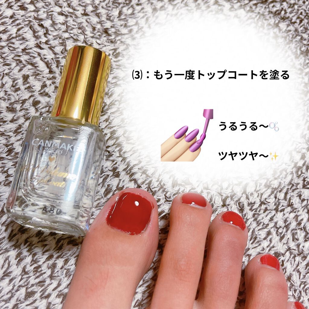 ツヤツヤにするのが好きなのとやっぱりトップコートした方が圧倒的に持ちが良くなるので必ず塗ってます✨ キャンメイクのカラフルネイルズはブラシが塗りやすくて好きなんですが、このトップコートのブラシは形が違くて正直カラフルネイルズの方が塗りやすいと思う、、 たっぷり付けるのがおすすめっぽいけど少量でもしっかりツヤ出るし後から重ねられるから私は少しずつ付けてます