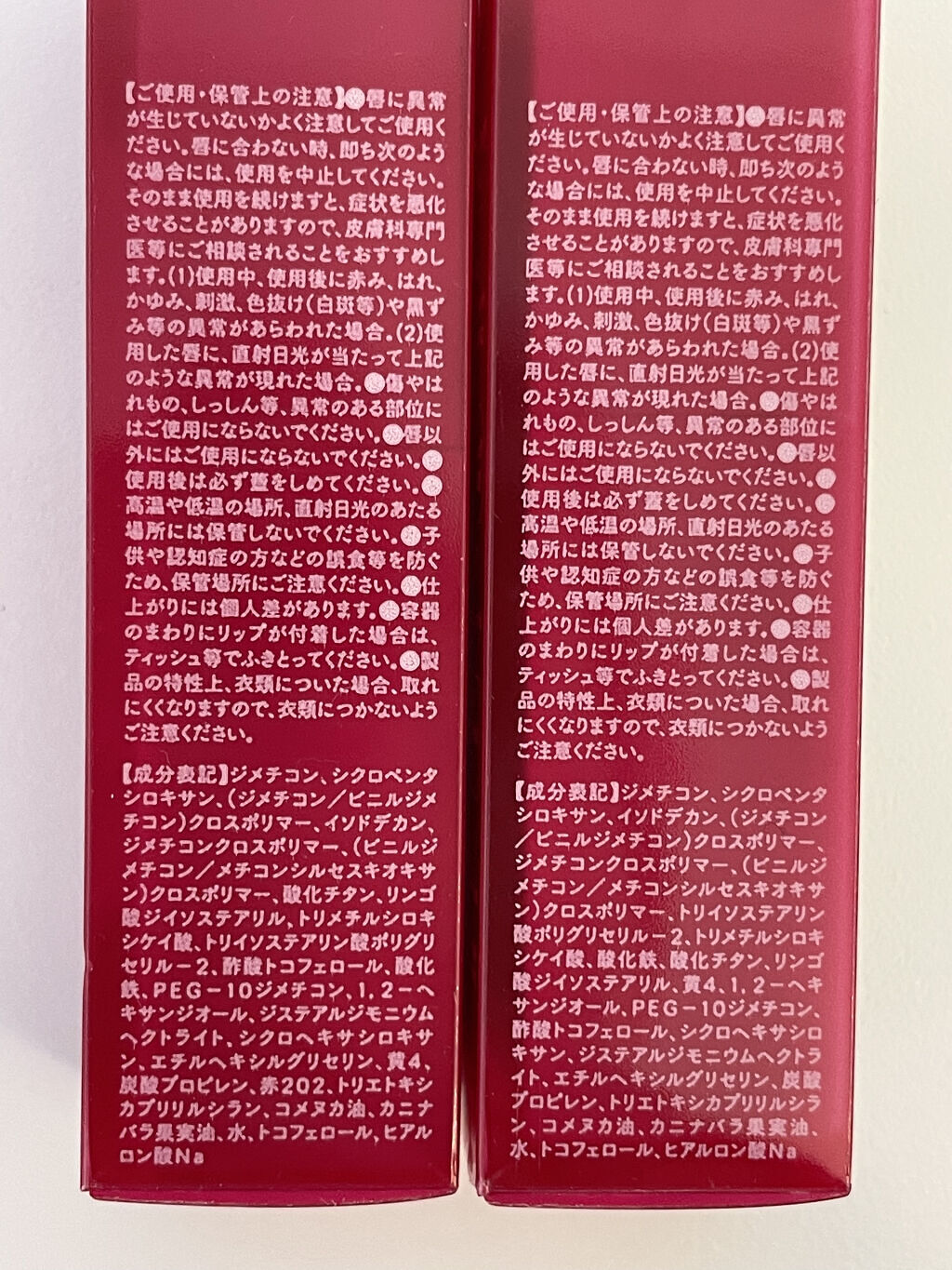 - <101 涙ショコラ(限定)> ジメチコン、シクロペンタシロキサン、イソドデカン、(ジメチコン/ビニルジメチコン)クロスポリマー、ジメチコンクロスポリマー、トリイソステアリン酸ポリグリセリル-2、(ビニルジメチコン/メチコンシルセスキオキサン)クロスポリマー、トリメチルシロキシケイ酸、黄4、酸化チタン、1,2-ヘキサンジオール、PEG-10ジメチコン、酢酸トコフェロール、酸化鉄、シクロヘキサシロキサン、ジステアルジモニウムヘクトライト、エチルヘキシルグリセリン、赤色202号、炭酸プロピレン、コメヌカ油、カニナバラ果実油、水、トコフェロール、ヒアルロン酸Na <01こっそりピンク> ジメチコン、シクロペンタシロキサン、イソドデカン、(ジメチコン/ビニルジメチコン)クロスポリマー、ジメチコンクロスポリマー、(ビニルジメチコン/メチコンシルセスキオキサン)クロスポリマー、トリイソステアリン酸ポリグリセリル-2、酸化鉄、トリメチルシロキシケイ酸、酸化チタン、リンゴ酸ジイソステアリル、1,2-ヘキサンジオール、酢酸トコフェロール、PEG-10ジメチコン、シクロヘキサシロキサン、ジステアルジモニウムヘクトライト、エチルヘキシルグリセリン、黄4、炭酸プロピレン、赤202、トリエトキシカプリリルシラン、コメヌカ油、カニナバラ果実油、水、トコフェロール、ヒアルロン酸Na <02ふいうちレッド> リンゴ酸ジイソステアリル、ダイマージリノール酸(フィトステリル/イソステアリル/セチル/ステアリル/ベヘニル)、水添ポリイソブテン、ビスジグリセリルポリアシルアジペート-2、トリイソステアリン酸ポリグリセリル-2、セレシン、マイクロクリスタリンワックス、乳酸メンチル、酸化チタン、1,2-ヘキサンジオール、酸化鉄、酢酸トコフェロール、香料、赤104(1)、黄4、青1、リナロール、リモネン、ヘキシルシンナマル <03じらしプラム> ジメチコン、シクロペンタシロキサン、イソドデカン、(ジメチコン/ビニルジメチコン)クロスポリマー、ジメチコンクロスポリマー、トリメチルシロキシケイ酸、トリイソステアリン酸ポリグリセリル-2、(ビニルジメチコン/メチコンシルセスキオキサン)クロスポリマー、酸化チタン、酸化鉄、リンゴ酸ジイソステアリル、1,2-ヘキサンジオール、酢酸トコフェロール、PEG-10ジメチコン、シクロヘキサシロキサン、赤202、エチルヘキシルグリセリン、黄4、ジステアルジモニウムヘクトライト、炭酸プロピレン、トリエトキシカプリリルシラン、コメヌカ油、カニナバラ果実油、水、トコフェロール、ヒアルロン酸Na <04 ほろよいピンク> ジメチコン、シクロペンタシロキサン、(ジメチコン/ビニルジメチコン)クロスポリマー、イソドデカン、ジメチコンクロスポリマー、(ビニルジメチコン/メチコンシルセスキオキサン)クロスポリマー、酸化チタン、リンゴ酸ジイソステアリル、トリメチルシロキシケイ酸、トリイソステアリン酸ポリグリセリル-2、酢酸トコフェロール、酸化鉄、PEG-10ジメチコン、1,2-ヘキサンジオール、ジステアルジモニウムヘクトライト、シクロヘキサシロキサン、エチルヘキシルグリセリン、黄4、炭酸プロピレン、赤202、トリエトキシカプリリルシラン、コメヌカ油、カニナバラ果実油、水、トコフェロール、ヒアルロン酸Na <05 きづいてテラコッタ> ジメチコン、シクロペンタシロキサン、イソドデカン、(ジメチコン/ビニルジメチコン)クロスポリマー、ジメチコンクロスポリマー、(ビニルジメチコン/メチコンシルセスキオキサン)クロスポリマー、トリイソステアリン酸ポリグリセリル-2、トリメチルシロキシケイ酸、酸化鉄、酸化チタン、リンゴ酸ジイソステアリル、黄4、1,2-ヘキサンジオール、PEG-10ジメチコン、酢酸トコフェロール、シクロヘキサシロキサン、ジステアルジモニウムヘクトライト、エチルヘキシルグリセリン、炭酸プロピレン、トリエトキシカプリリルシラン、コメヌカ油、カニナバラ果実油、水、トコフェロール、ヒアルロン酸Na