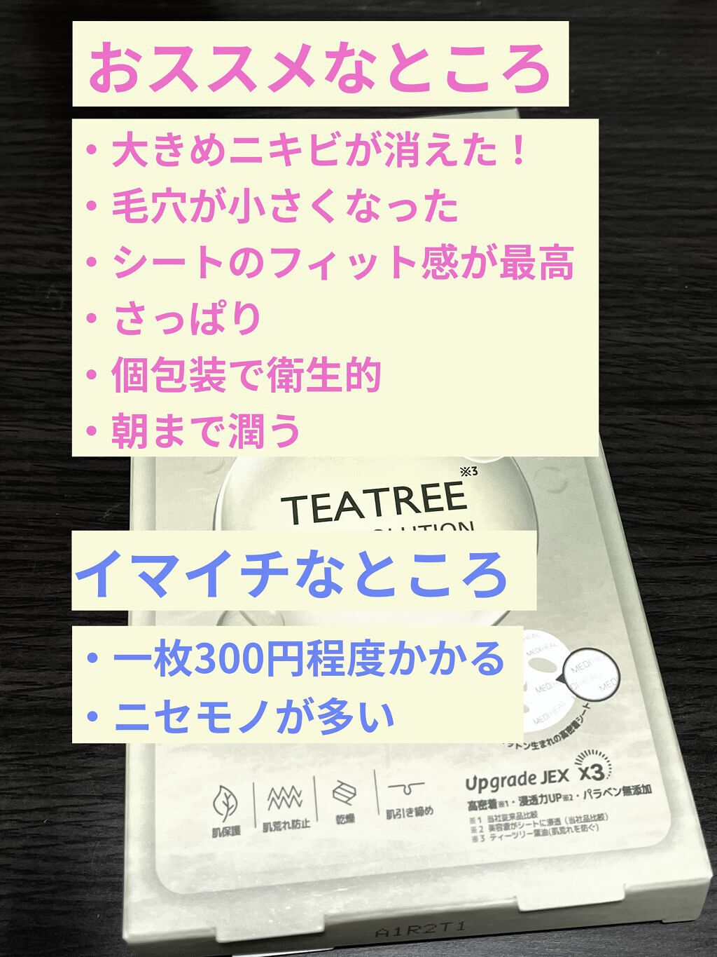 メディヒールの言わずと知れた名品。鎮静効果のあるティーツリーのフェイスマスク! 肌荒れしているときや、日焼けした後におすすめです。 使用感はさっぱりで、これだけでは保湿力が物足りないためクリームなどで蓋をすると良いと思います!
