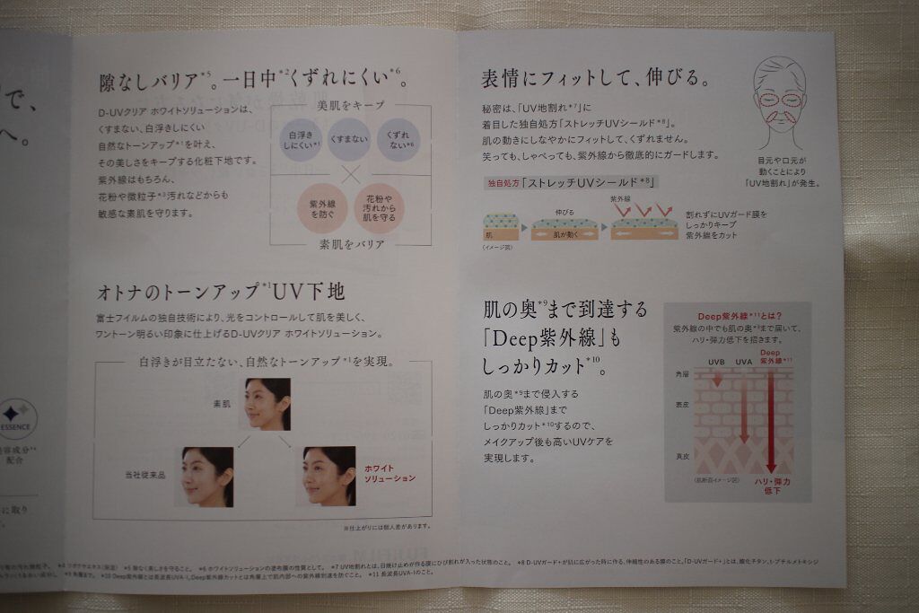 - トーンアップ*1するクリア肌を実現するUV下地です。 表情変化等でたくさん動く肌でも、伸縮性のあるD-UVガード+*2膜が肌にぴったりフィット。 「いつのまにか日焼け」を防ぎ、透明美白肌*1に整えます。 *1 メイクアップ効果による。 *2酸化チタン、t-ブチルメトキシジベンゾイルメタン(紫外線防御剤)、トリ(トリメチルシロキシ)シリルプロピルカルバミド酸プルラン(うるおい成分)。