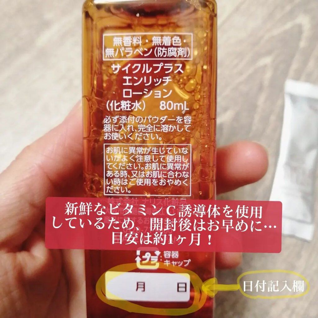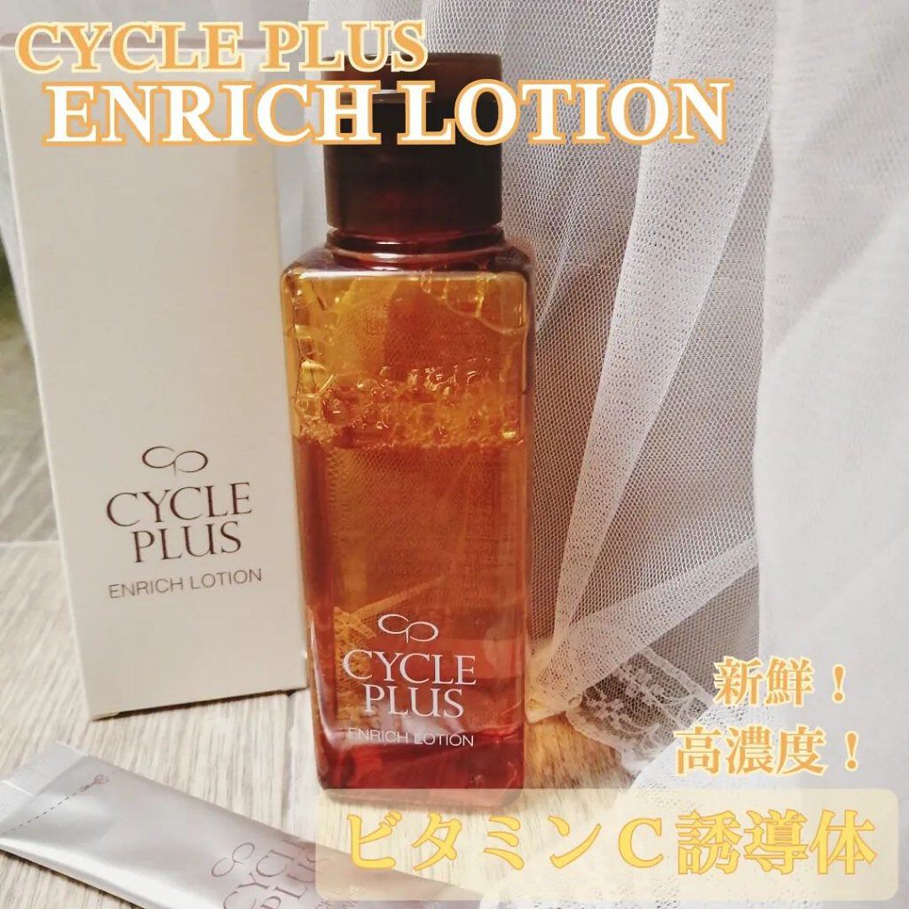 サイクルプラスエンリッチローションパウダー使用前に混ぜる高浸透型ビタミンC誘導体が肌を引き締めます。パウダーを化粧水に入れてボトルを良く振り、パウダーが良く溶けてから使用するユニークなタイプの化粧水です。化粧水は透明で香りもありません。自分で...