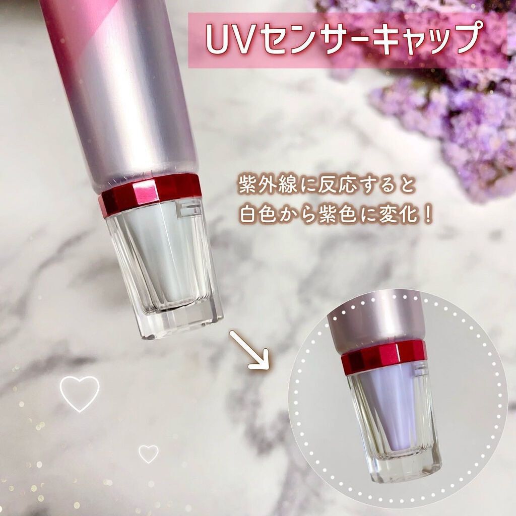 SPF50+PA++++と紫外線カット効果が高いので、しっかりと日焼け対策したい方におすすめのアイテムです😍 テクスチャーは伸びが良くて、さらっとした塗り心地! キャップ部分がUVセンサーになっていて、紫外線にあたると紫色に変化する面白い工夫も💜 1品で3役の機能があるから、忙しい朝にピッタリ☀️