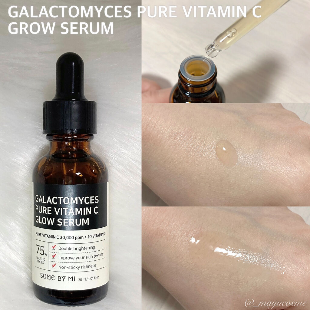 米の発酵抽出物であるガラクトミセス75%、純粋ビタミンC 30,000ppm、ナイアシンアミド20,000ppmを配合した超強力な抗酸化美白セラム✨ くすんだ肌や荒れた肌、敏感肌におすすめ💡 ややとろみのあるテクスチャーで肌馴染み◎ ベタつかずしっとり、もちっとした仕上がり✨