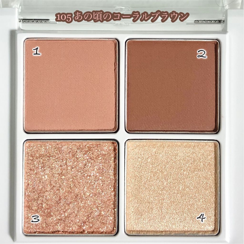 全体的には、名前のとおりヌーディーな印象☺️定番色「01 本命のブラウン」と似てるんだけど、今回の「104 本能のヌードベージュ」の方が、よりヌーディーなカラーとなっておりまする💁🏻♀️ 左上のベージュカラー(1番)は、基本的にはマットカラーなんだけど、ほんのりラメも入ってるから、のっぺりとした印象にならなくて良き🥰 4番のカラーは、ハイライトとして使うこともできるし、個人的には涙袋に使っても良いのではないかと思っておりまする👻 こちらは、全体的にしっとりとしたテクスチャーとなっておりまする💖そして、上2色のマットカラーが、結構しっかり発色してくれます❣️ 右下のハイライトカラーも、「104 本能のヌードベージュ」ほど白っぽくならないので、さりげなくハイライトを入れたい人にピッタリ✨