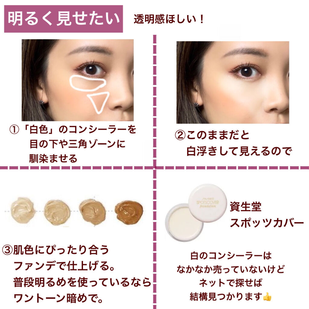 締め色を広くのせる アイシャドウの暗めの色を幅広くのせると まつげが目立ちにくくなってしまう💧 締め色は正面から見た時に まつげの先端よりも狭い範囲にしよう🙆♀️ 眉が明るすぎる 垢抜けには眉を明るく!とよく言うけど 明るくしすぎると悪目立ちして 目のインパクトが弱くなるよ⚠️ バランスが大事☝️ コンシーラーをキワまで塗る 陰影を出してくれる涙袋や まつげのキワまで塗ってしまうと 目がキュッと小粒にみえるよ🙅♀️ コンシーラーは涙袋より下に!