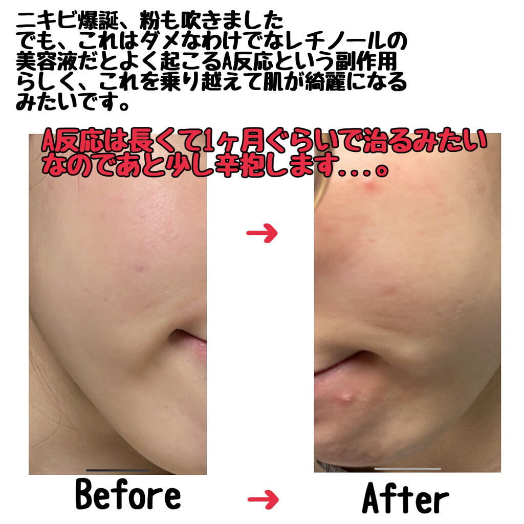 毛穴や角栓対策に、レチノールを検討。初めて使うのでマイルドそうな刺激のこちらを購入。基本は夜のみの使用でお風呂上がり後すぐ、ビタミンC美容液、アゼライン酸クリームと併用して1ヶ月ほど。A反応は全く出ず、ひりつくこともないです。朝も使ってみた時...