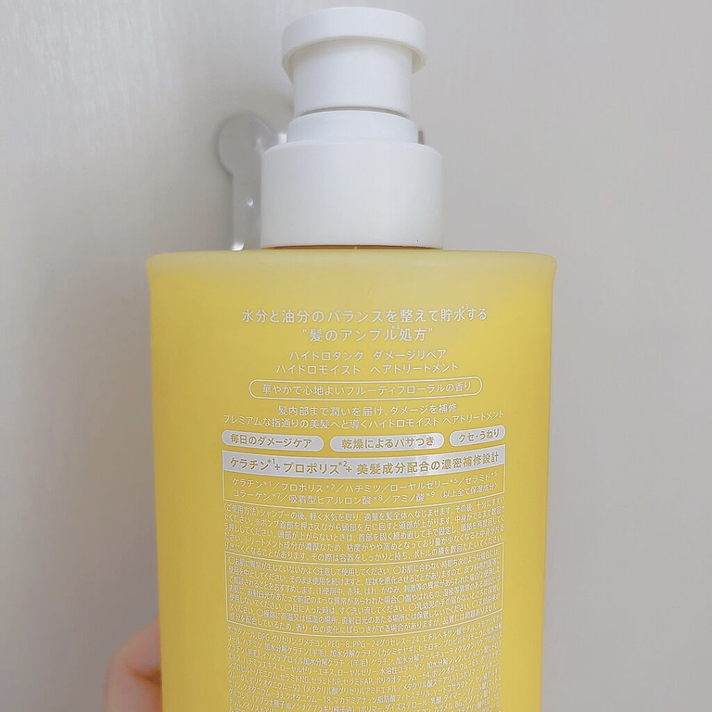 - 分子量の異なるケラチン*1と、プロポリス*2・ハチミツ*3をはじめとする豊富な保湿成分を厳選して配合した「髪のアンプル*4処方」。きめの細かい濃密な泡立ちのシャンプーが、髪に負担の少ない使い心地で汚れをしっかり落とします。さらに、こっくりとしたリッチなヘアトリートメントが浸透しながら密着して、髪内部に潤いを貯水*5し、キューティクルを補修。プレミアムな指通りの美髪へと導きます。華やかで心地よいフルーティフローラルの香り。 *1 ハイドロタンク ダメージリペア ハイドロモイスト シャンプー:加水分解ケラチン(羊毛)、加水分解ケラチン(カシミヤヤギ)、ステアルジモニウムヒドロキシプロピル加水分解ケラチン(羊毛)、ケラチン(羊毛)、イソステアロイル加水分解ケラチン(羊毛)/ハイドロタンク ダメージリペア ハイドロモイスト ヘアトリートメント:ケラチン、加水分解ケラチン(カシミヤヤギ)、加水分解ケラチン(羊毛)、ヒドロキシプロピルトリモニウム加水分解ケラチン(羊毛)、加水分解ウールキューティクルタンパク、イソステアロイル加水分解ケラチン(羊毛)(全て保湿) *2 プロポリスエキス(保湿) *3 保湿 *4 アンプル処方とは美髪成分を配合した処方 *5 毛髪に潤いを与え保つこと
