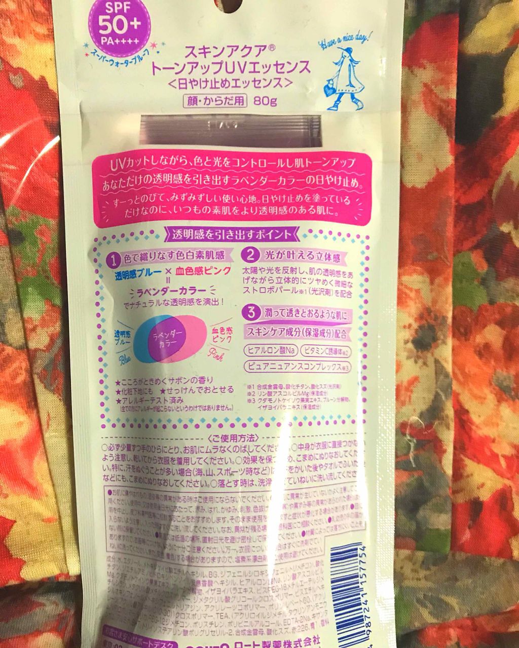 - ※カラー名称「ハピネスオーラ」は「ローズ」へ名称変更となりました。 <ミントグリーン> 赤み補正*1!UVカットしながら、色と光をコントロールし、肌をトーンアップ*1。 ミントグリーンカラーで透き通るような素肌つづく!エッセンスタイプの日焼け止め。 透明感*1のある肌に。 SPF50+、PA++++、UV耐水性★★。 鉱物油フリー。パラベンフリー。ときめくサボンの香り。 <ラベンダー> 明るさ補正*1!UVカットしながら、色と光をコントロールし、肌をトーンアップ*1。 透明感*1を引き出すラベンダーカラーの日焼け止め。 すーっとのびて、みずみずしい使い心地のエッセンスタイプ。 SPF50+、PA++++、UV耐水性★★。 鉱物油フリー。パラベンフリー。ときめくサボンの香り。 <ローズ> 血色感補正*1!UVカットしながら、色と光をコントロールし、肌をトーンアップ*1。 ローズカラーで血色をプラスし、透明感*1のある肌に。 エッセンスタイプの日焼け止め。 SPF50+、PA++++、UV耐水性★★。 パラベンフリー。ハピネスブロッサムの香り。 <ブルー> UVカットしながら、色と光をコントロールし、肌をトーンアップ*1。 血色感を抑えて儚げな色白肌*1に見せるブルーカラーの顔・からだ用日やけ止め。すーっとのびて、みずみずしい使い心地。 透明感ブルー×透明感ホワイト=はかなげブルーカラーで、自分史上最高*2の色白肌*1、うるおう美容液成分(うるおい成分)としてヒアルロン酸Na、ビタミンC誘導体*3配合。 SPF50+/PA++++。こころがときめくサボンの香り。化粧下地にも。石けんで落とせます。 パラベンフリー。鉱物油フリー。アレルギーテスト済み(全ての方にアレルギーが起こらないというわけではありません)。 *1:メイクアップ効果による *2:スキンアクアシリーズにおいて *3:リン酸アスコルビルMg(うるおい成分)