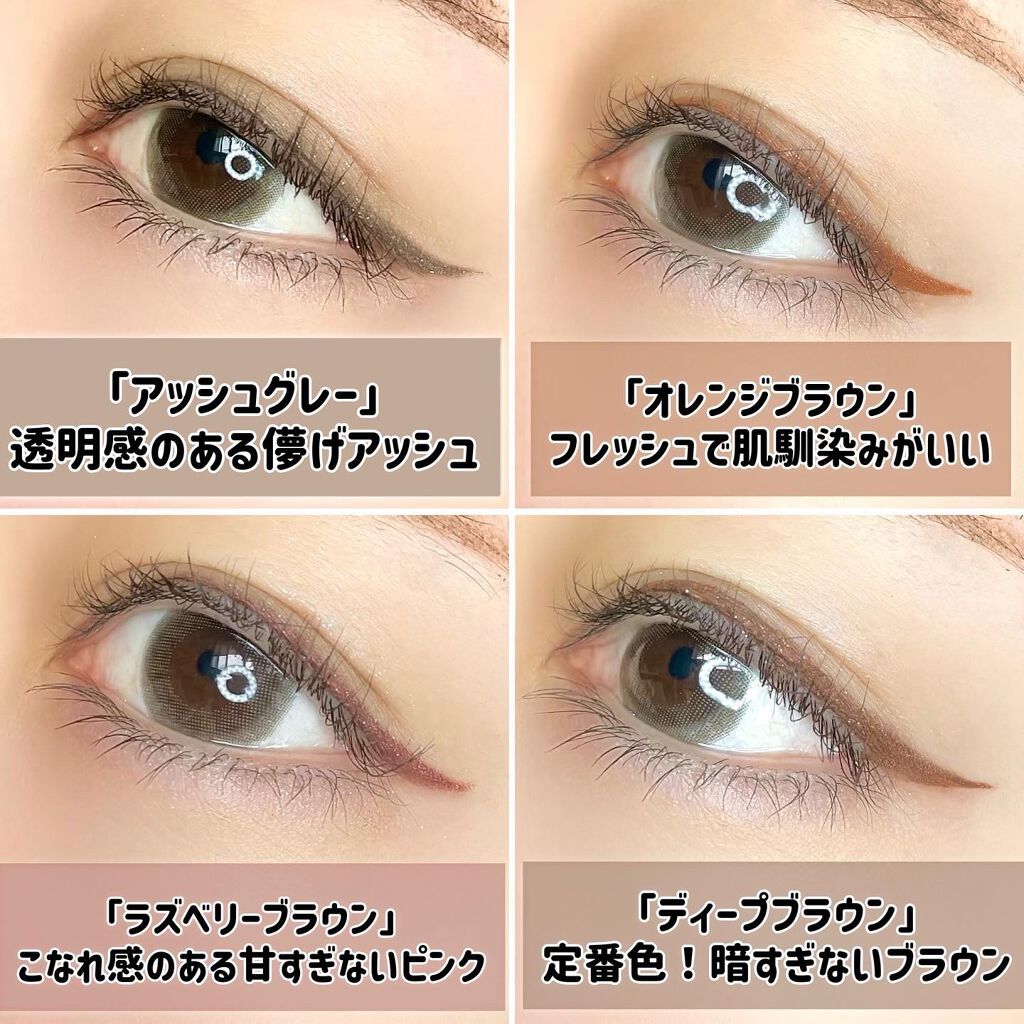 新2色を含めた全11色展開となりました❣️ ぷるんと甘かわレンズの2色が追加されたのですが、こちらがとにかく可愛らしくて😮💨 新色は、まるでゼリーのようなぷるんとした瞳を作り上げてくれる一目惚れカラコン☺️❤️ [ひとめぼれの恋] 甘くやわらかなウォームブラウン。 甘いブラウンが抜け感満載!透明感もとても綺麗です✨ [くぎづけの心] 淡く透明感のあるアッシュベージュ。 抜け感のあるくすみアッシュカラーが透き通るような瞳を演出します✨ 付け心地は乾き、ゴロゴロを感じず一日の使用時間長く着用していても気になりにくかったです ✨