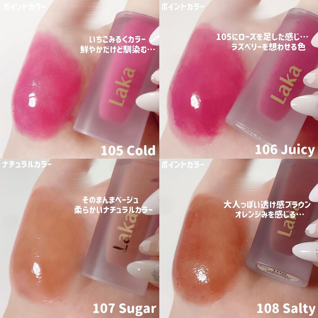 においが 朝食りんごヨーグルト。🍏🍎 テクスチャーがかるくてみずみずしい! 光沢感がすごい…めちゃめちゃ潤うしうるうるつやつや! このティントのつよみは色持ちがとにかくいいこと! 完全ヴィーガンなのも嬉しいポイント。果汁配合もしているそうです❤︎ 101 Joyful イエベ春さんにぴったり明るいピンクコーラル 102 Dewy 暗めのローズにプラムを足したような葡萄のような色味がとってもかわいい🍇💜 103 Humming くすみピンクベージュのMLBBカラー 104 Cherry 鮮やかなちゅるちゅるクリアレッド🍒 105 Cold 流行りのいちごみるくカラー! 106 Juicy 105より深み赤みがつよめのラズベリーカラー 107 Sugar まさにらそのまんまベージュ。 108 Salty ナチュラルな透け感ブラウン 商品名の通り果物を想わせるような色味が多かったです○´・ェ・`○