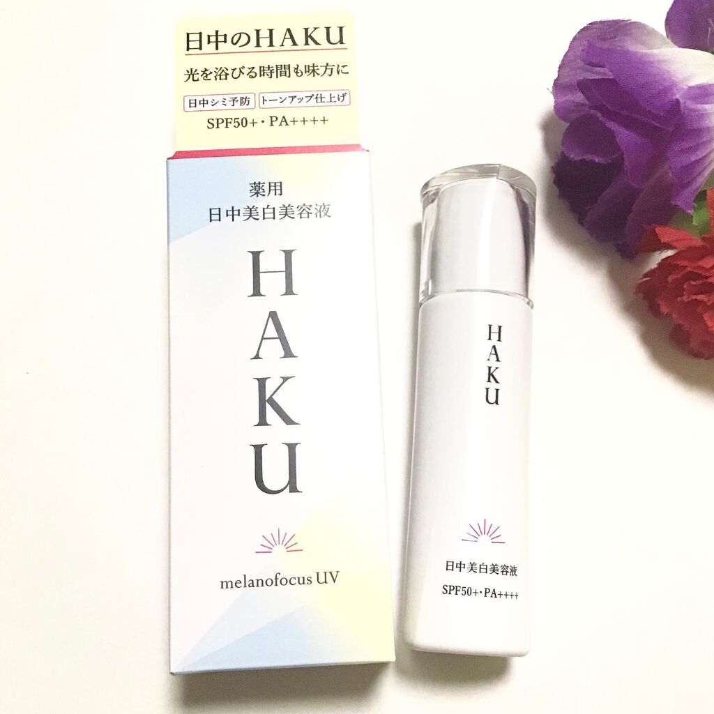 - 販売名「メラノフォーカスUV」 SPF50+・PA++++ 日中のHAKU。光を浴びる時間も味方に、日中だからできる美白ケアのアプローチ。 シミ予防研究の先端技術を搭載し、日中ならではの美白ケアを可能にした、薬用日中美白美容液です。光を浴びる時間も味方にして、明るく透明感のある肌に導きます。 ○2種の美白有効成分を肌の奥まで届け効かせる。 ○日中の肌環境に着目し、Wデイエフェクターを配合。うるおいを与え届ける。 〇ファインレッドパールαが効果的に光を放ち、シミや色ムラを目立たせない。トーンアップ効果で、明るく透明感のある仕上がり。 〇みずみずしい美容液がスーッとなじむ。化粧下地としても使える。 ○無香料・アレルギーテスト済み・ニキビのもとになりにくい処方。 (全てのかたにアレルギーが起きない、ニキビができないというわけではありません)。