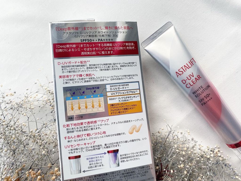 光をコントロールして肌を美しく、ワントーン明るい印象に仕上げる。 肌の奥まで侵入する「Deep紫外線」までしっかりカットするので、メイクアップ後も高いUVケアを実現。 紫外線にあたるとキャップが紫色に変化する事を知りました!自宅でも試したのですが、屋内の窓際でも鮮やかな紫に!!