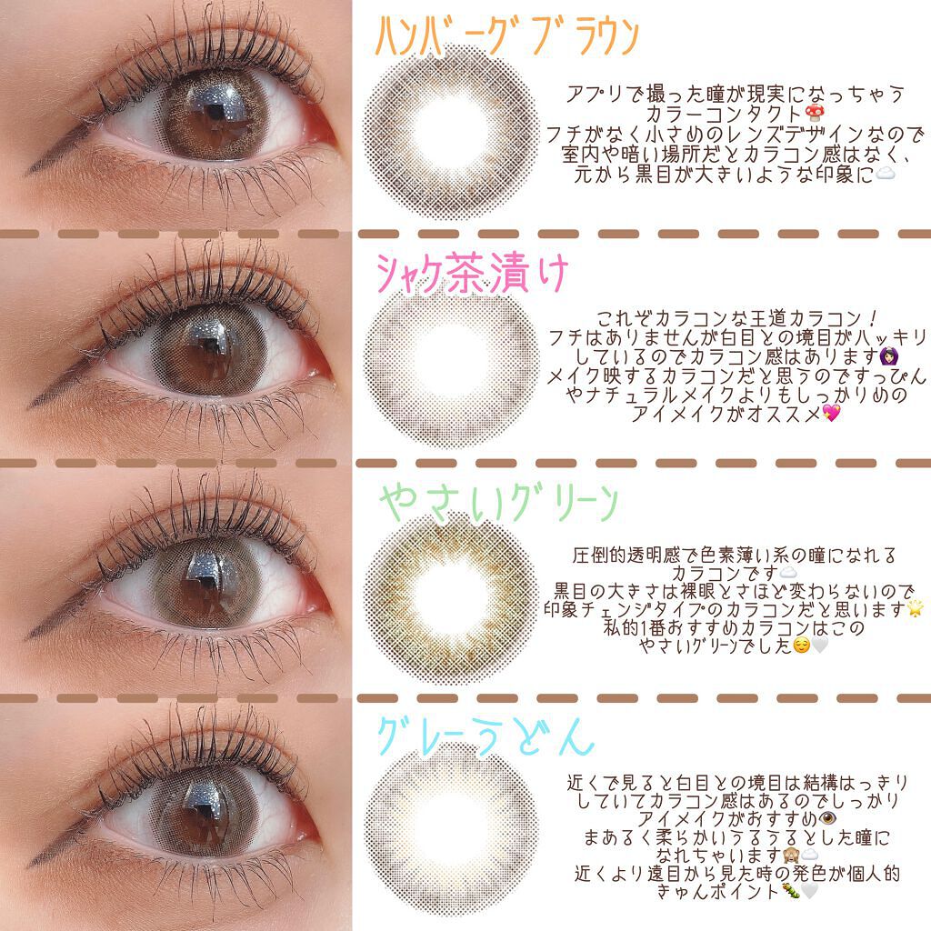 グレーうどんっていうカラーでナチュラルに盛れるグレージュカラーです☺️ 私の瞳はけっこう黒いのであまり明るすぎるカラーだと浮いてしまうのですがグレーカラーが自分の瞳のカラーと馴染ませてくれて使いやすいカラコンです😊 瞳もひとまわり大きくしてくれて盛れます🥹 どんなメイクとも合わせやすいのですがわたしはブラウンやオレンジメイクをする時に使いたいなと思います😊 着け心地も痛くなることがなかったのでおすすめです!