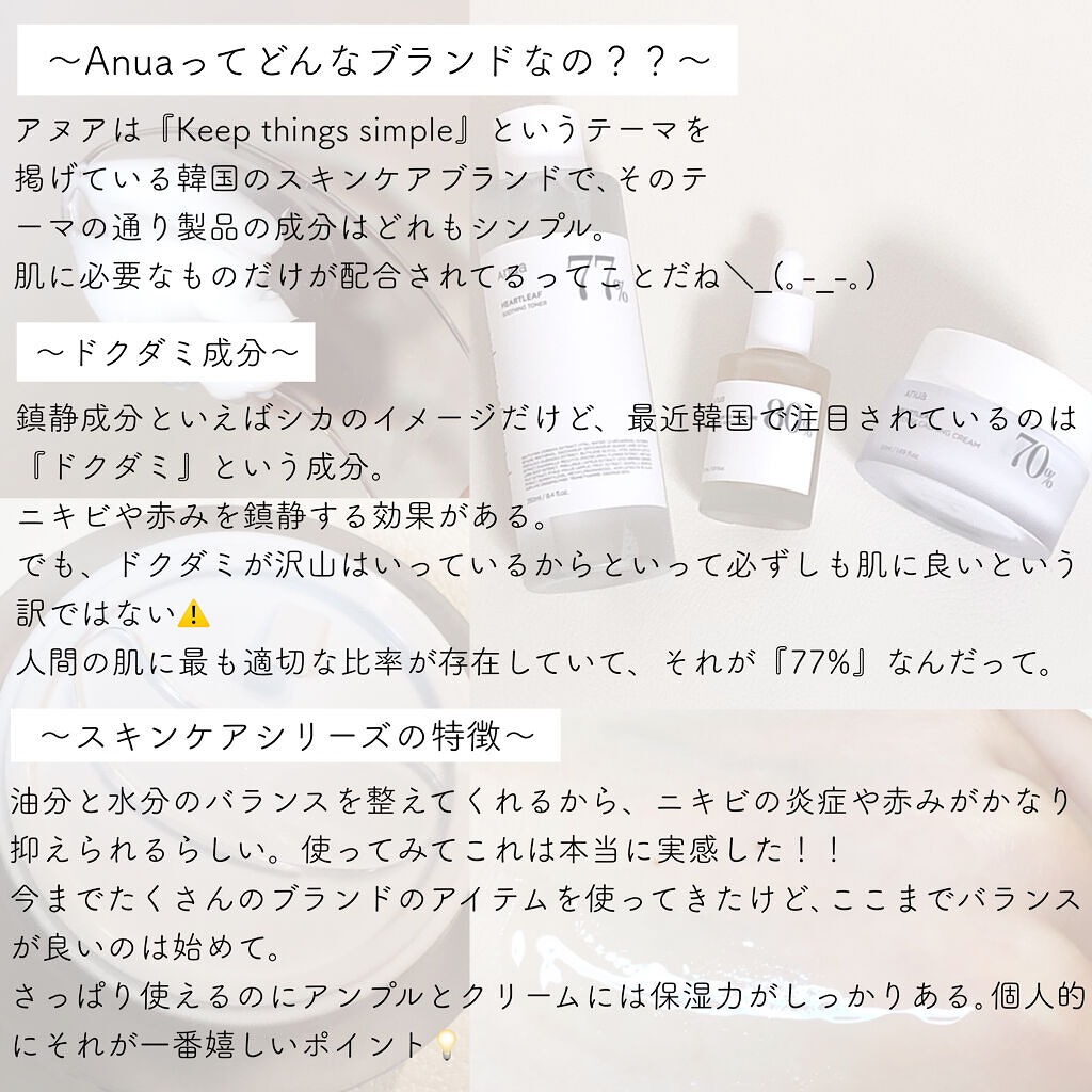 Anua 聞いた事はあったけどどんな効果があるか分からなかったから、可愛い犬さんの細かいレビュー のおかげで知れて良かった!!✨- ̗̀ ♡ ̖́- ほんとにタメになりますᐠ ♡ ᐟ