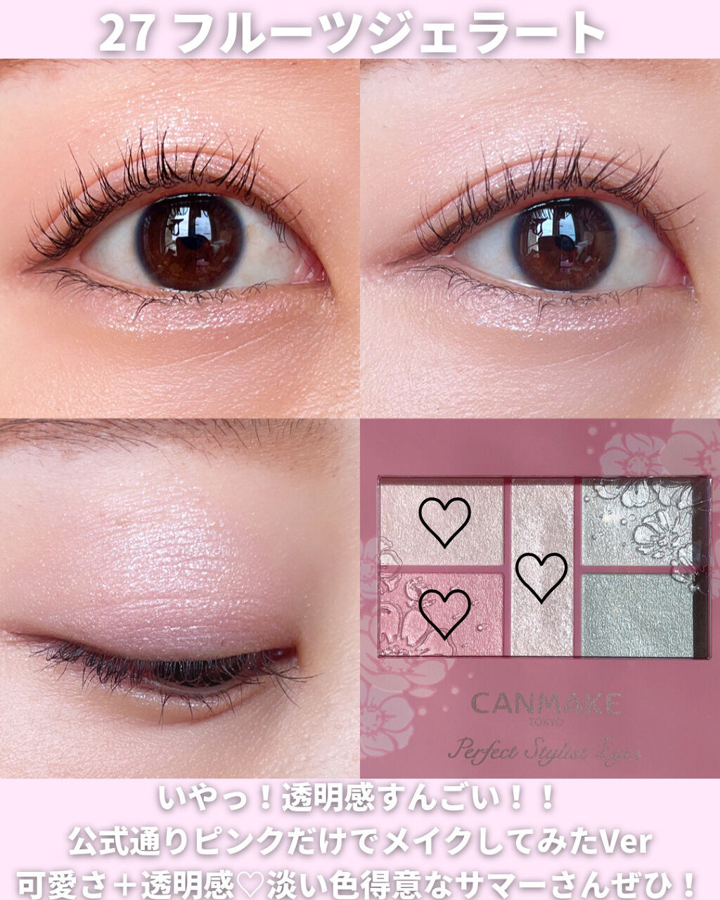 - 1枚のパレットで2つのスタイルが完成! 5色の欲ばりアイシャドウ♥ メインカラーを選んで2つのスタイルが楽しめる! A→B→D でスタイル1 A→C→D でスタイル2 繊細な粉質が、しっとりとまぶたに密着して色落ちを防ぎます。 透明感のあるキラうるトッピングジュエル(繊細ラメ)は、気分によってトッピング!