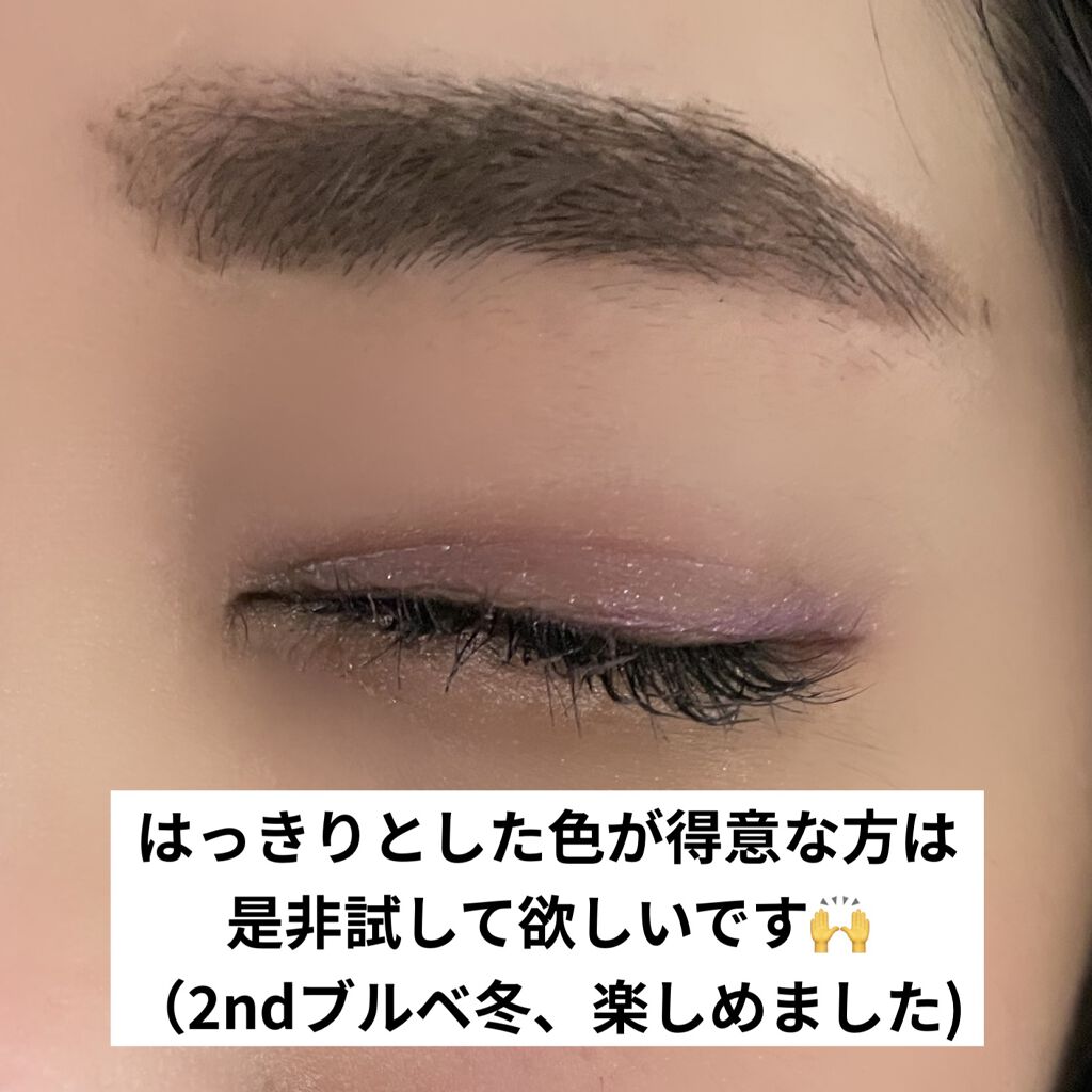 暗めではっきりしているので、ブルベ冬向けさんかなと思いました。 結構肌に密着しますし、結構はっきり色が出ますので、インパクトあるアイシャドウだと思います😎 暗めでラメがあり、比較的クセが強いものだと思いますが、個性的な印象を与えたい時に使えると思います✨