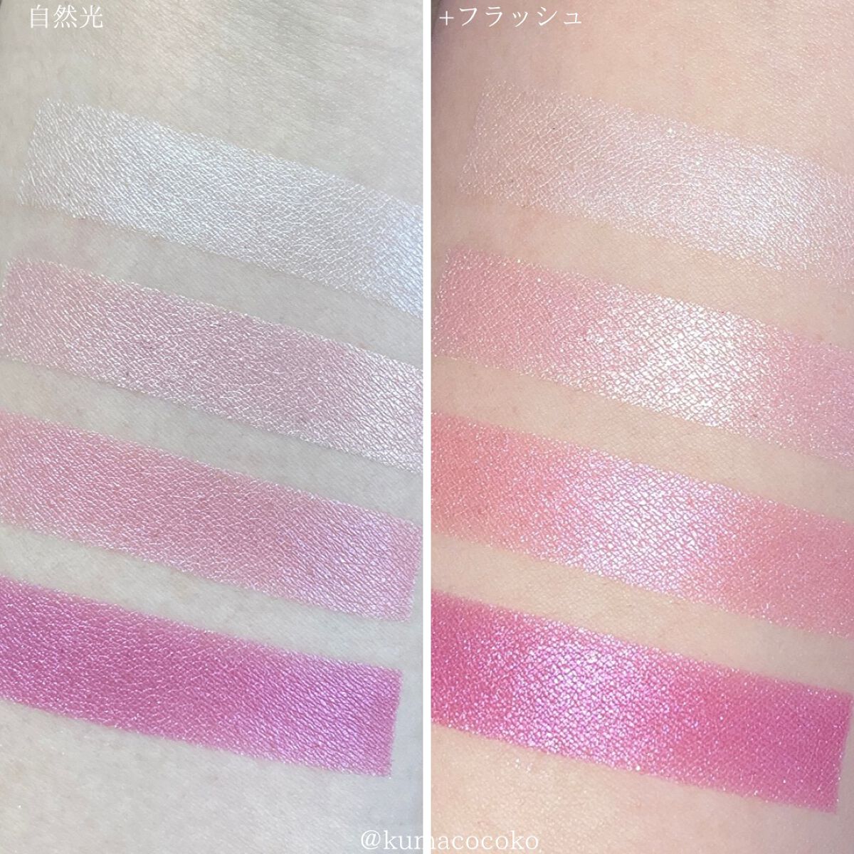 光に当てると、ブルーやピンク、シルバーにゴールドのキラキララメがとっても可愛いです♡ ぷにっと柔らかいアイシャドウですので、馴染みがよく、指でサッッっと塗ることができます。もちろんブラシでも◎です♪ ラメを重ねることでいつものアイシャドウの雰囲気が変わります♪