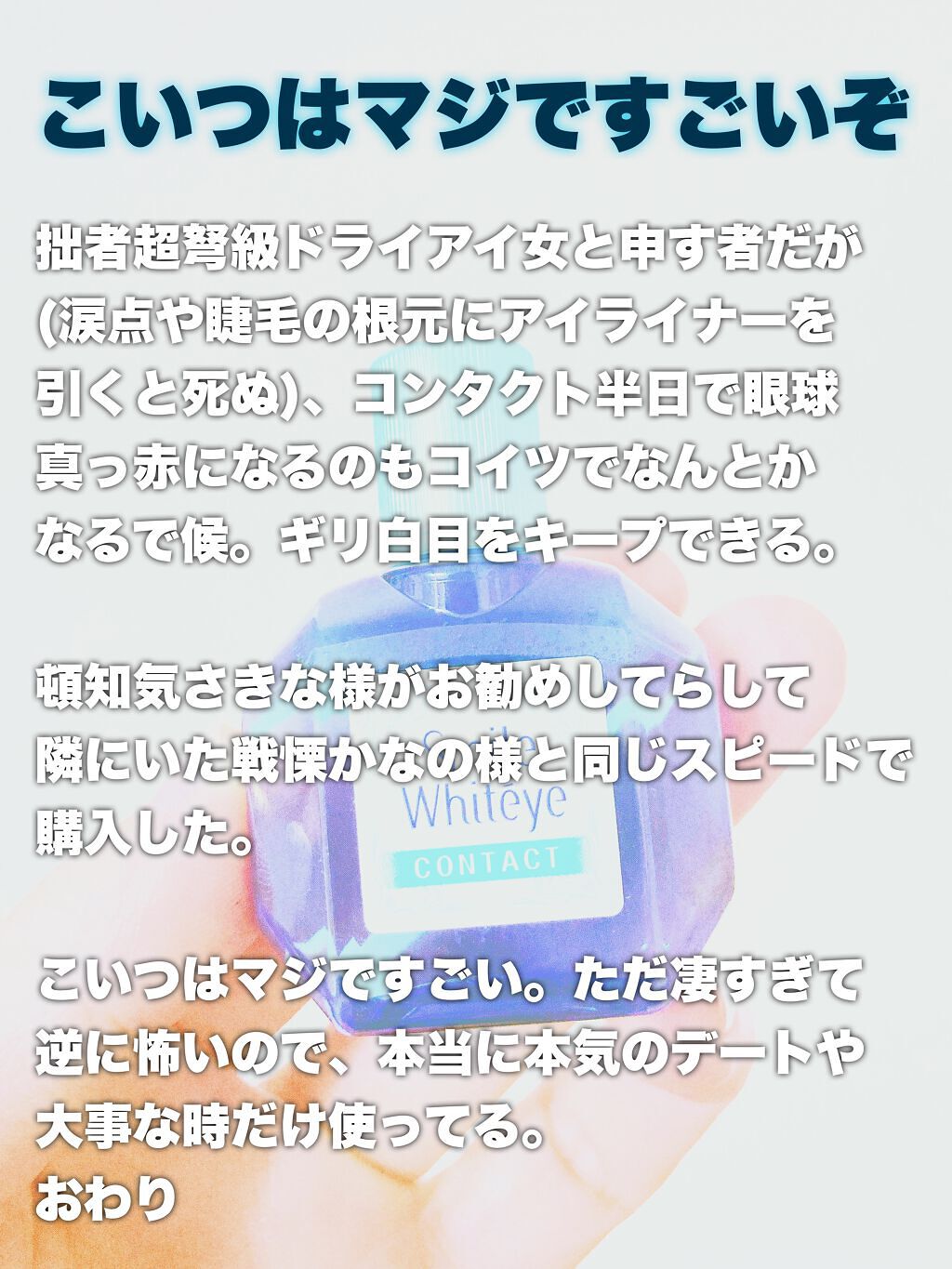 スマイルホワイティエ コンタクト。マジでスゴい。コンタクトしたら半日で目真っ赤になるのをなんとかギリギリのところで最後まで白目をキープしてくれるドライアイ女の命綱。お前がいないと恋も愛も友情も何も始まらない。ちなみに最近は花粉症で地獄を見てい...