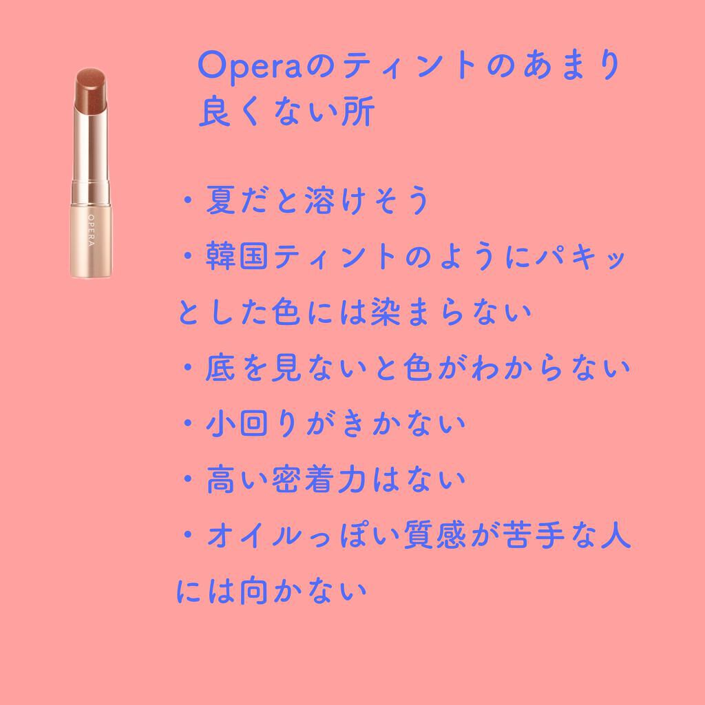 OPERAオペラリップティントN06ピンクレッド復刻新色【色】◎色めっちゃいい。赤くなりすぎず程よくピンクが中和してパキッとならないからいろんなメイクや服に合うと思う。【唇との相性】△私には相変わらず保湿必須。【コスパ】◯¥1,760一般的な...