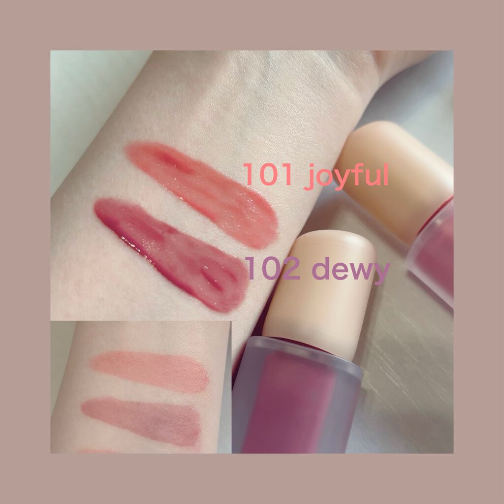 - <101 ジョイフル> 水、リンゴ酸ジイソステアリル、ダイマージリノール酸(フィトステリル/イソステアリル/セチル/ステアリル/ベヘニル)、ジイソステアリン酸ダイマージリノレイル、ノナイソステアリン酸ポリグリセリル-10、オクチルドデカノール、ビスジグリセリルポリアシルアジペート-2、水添ポリイソブテン、セチルPEG/PPG-10/1ジメチコン、ポリソルベート60(小麦由来)、イソステアリン酸ソルビタン(小麦由来)、1,2-ヘキサンジオール、グリセリン、ベヘニルアルコール、(アクリル酸/MA)コポリマーNa、ペンチレングリコール、BG、ポリアクリレート-13、トロメタミン、(アクリレーツ/アクリル酸アルキ ル(C10-30 )クロスポリマー、エチルヘキシルグリセリン、ポリイソブテン、(アクリル酸ヒドロキシエチル/アクリロイルジメチルタウリンNa)コポリマー、スクワラン、デヒドロ酢酸、ステビオシド、香料、フィチン酸、カプリリルグリコール、ジメチコン、水添ロジン酸メチル、水酸化Al、ポリソルベート20(小麦由来)、トコフェロール、ライム果汁、キイチゴ果汁、レモン果汁、マンゴー果汁、フラガリアチロエンシス果汁、アンズ果汁、オレンジ果汁、グレープフルーツ液汁、キウイ果汁、パパイア果汁、[+/-]酸化チタン、黄4、黄5、赤 104(1)、赤227、青1 <102 デューイ> 水、リンゴ酸ジイソステアリル、ダイマージリノール酸(フィトステリル/イソステアリル/セチル/ステアリル/ベヘニル)、ジイソステアリン酸ダイマージリノレイル、ノナイソステアリン酸ポリグリセリル-10、オクチルドデカノール、ビスジグリセリルポリアシルアジペート-2、水添ポリイソブテン、セチルPEG/PPG-10/1ジメチコン、ポリソルベート60(小麦由来)、イソステアリン酸ソルビタン(小麦由来)、1,2-ヘキサンジオール、グリセリン、ベヘニルアルコール、(アクリル酸/MA)コポリマーNa、ペンチレングリコール、BG、ポリアクリレート-13、トロメタミン、(アクリレーツ/アクリル酸アルキル(C10-30))クロスポリマー、エチルヘキシルグリセリン、ポリイソブテン、(アクリル酸ヒドロキシエチル/アクリロイルジメチルタウリンNa)コポリマー、スクワラン、デヒドロ酢酸、ステビオシド、香料、フィチン酸、ジメチコン、水添ロジン酸メチル、水酸化Al、カプリリルグリコール、ポリソルベート20(小麦由来)、トコフェロール、ライム果汁、キイチゴ果汁、レモン果汁、マンゴー果汁、フラガリアチロエンシス果汁、アンズ果汁、オレンジ果汁、グレープフルーツ液汁、キウイ果汁、パパイア果汁、酸化チタン、赤227、黄5、黄4、青1 <103 ハミング> 水、リンゴ酸ジイソステアリル、ダイマージリノール酸(フィトステリル/イソステアリル/セチル/ステアリル/ベヘニル)、ジイソステアリン酸ダイマージリノレイル、ノナイソステアリン酸ポリグリセリル-10、オクチルドデカノール、ビスジグリセリルポリアシルアジペート-2、水添ポリイソブテン、セチルPEG/PPG-10/1ジメチコン、ポリソルベート60(小麦由来)、イソステアリン酸ソルビタン(小麦由来)、1,2-ヘキサンジオール、グリセリン、ベヘニルアルコール、(アクリル酸/MA)コポリマーNa、ペンチレングリコール、BG、ポリアクリレート-13、トロメタミン、(アクリレーツ/アクリル酸アルキル(C10-30))クロスポリマー、エチルヘキシルグリセリン、ポリイソブテン、(アクリル酸ヒドロキシエチル/アクリロイルジメチルタウリンNa)コポリマー、スクワラン、デヒドロ酢酸、ステビオシド、香料、フィチン酸、ジメチコン、水添ロジン酸メチル、水酸化Al、カプリリルグリコール、ポリソルベート20(小麦由来)、トコフェロール、ライム果汁、キイチゴ果汁、レモン果汁、マンゴー果汁、フラガリアチロエンシス果汁、アンズ果汁、オレンジ果汁、グレープフルーツ液汁、キウイ果汁、パパイア果汁、酸化チタン、黄5、赤227、青1 <104 チェリー> 水、リンゴ酸ジイソステアリル、ダイマージリノール酸(フィトステリル/イソステアリル/セチル/ステアリル/ベヘニル)、ジイソステアリン酸ダイマージリノレイル、ノナイソステアリン酸ポリグリセリル-10、オクチルドデカノール、ビスジグリセリルポリアシルアジペート-2、水添ポリイソブテン、セチルPEG/PPG- 10/1ジメチコン、イソステアリン酸ソルビタン(小麦由来)、ポリソルベート60(小麦由来)、1,2-ヘキサンジオール、グリセリン、ベヘニルアルコール、(アクリル酸/MA)コポリマーNa、ペンチレングリコール、BG、ポリアクリレート-13、ト ロメタミン、(アクリレーツ/アクリル酸ア ルキル(C10-30))クロスポリマー、エチルヘキシルグリセリン、ポリイソブテ ン、(アクリル酸ヒドロキシエチル/アクリ ロイルジメチルタウリンNa)コポリマー、スクワラン、デヒドロ酢酸、ステビオシド、香料、カプリリルグリコール、ポリソルベー ト20(小麦由来)、トコフェロール、ライム果汁、キイチゴ果汁、レモン果汁、マンゴー 果汁、フラガリアチロエンシス果汁、アンズ 果汁、オレンジ果汁、グレープフルーツ液 汁、キウ