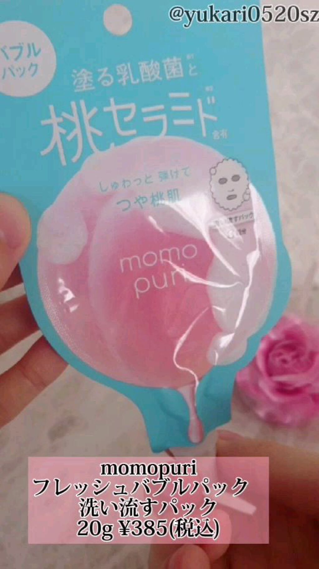 ももぷりフレッシュバブルパック【使った商品】ももぷりフレッシュバブルパック【商品の特徴】¥440円(税込)20g3回分洗い流すパックヨーグルトエキス成分配合【使用感】使い切りやすいサイズ感と量柔らかいフォームで人工ピーチが序盤に香る塗布して少...