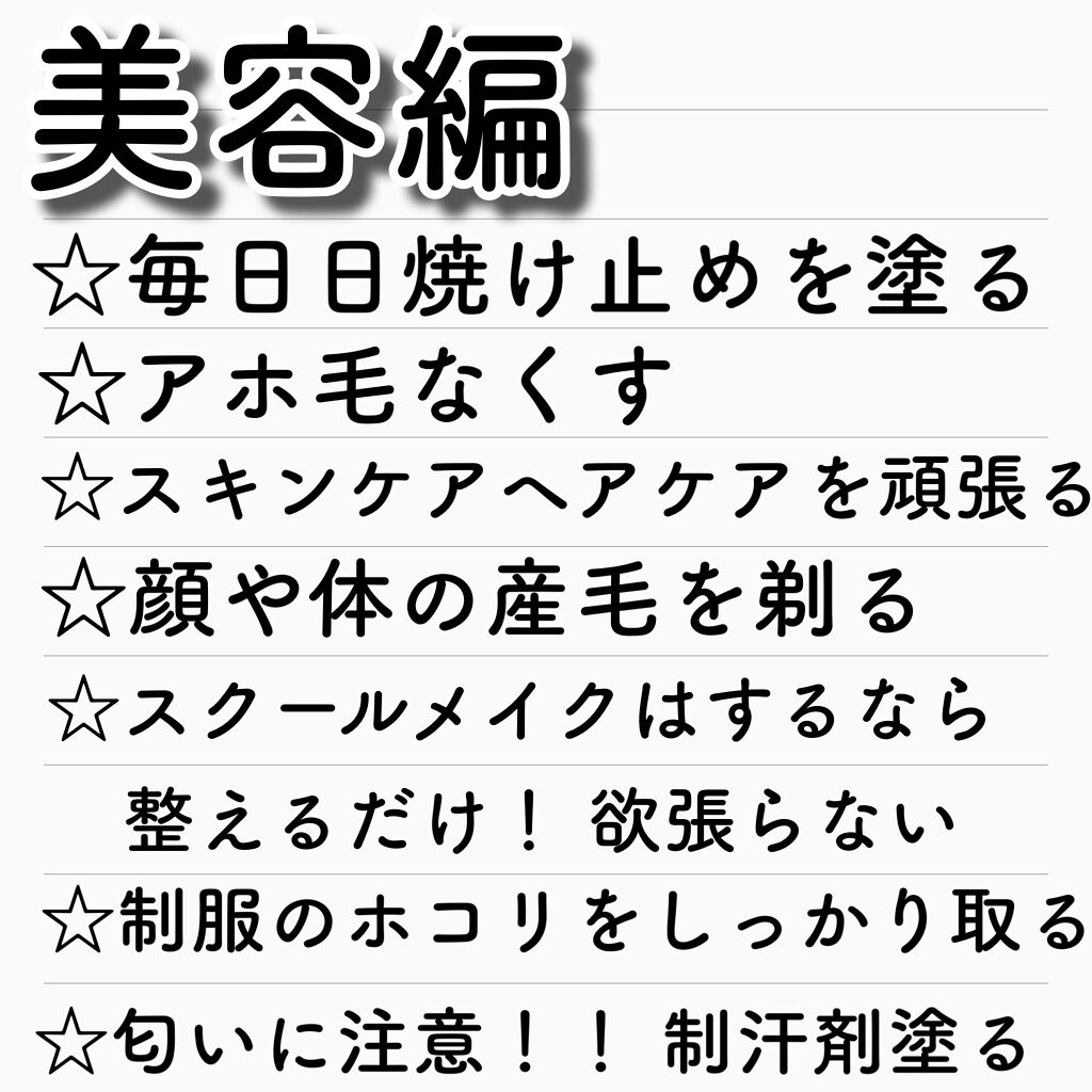挨拶って人の第一印象が決まるし 礼儀正しく見えるからとっても大事です! ワンストップ挨拶は更に上級者です✨ 猫背よりも綺麗な姿勢の方が 印象が良くなります🥺 話を聴く時はうなずきながら 『あの人がうなずくだけで出る勇気』 という言葉があります! 笑顔で接する 話しかける時とかに真顔よりも笑顔の方がいいですよね() 校則は必ず守る! 爪は手のひらから見えないのがベスト 係活動など積極的に取り組む 敬語をしっかり使う 『はてな』は常備 絆創膏やナプキンは持っておくといざという時役立つ ミラーとリップも大事ー! マスクの替え