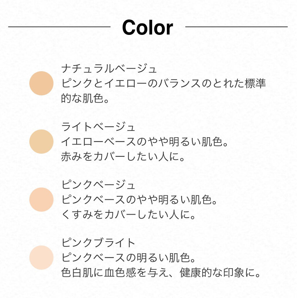 - <ナチュラルベージュ> 水、炭酸ジカプリリル、トリエチルヘキサノイン、BG、シリカ、セスキイソステアリン酸ソルビタン、ポリリシノレイン酸ポリグリセリル−6、マイカ、イチゴ果汁、ホホバ種子油、オリーブ果実油、グリチルレチン酸ステアリル、デキストリン、トコフェロール、ジステアルジモニウムヘクトライト、イソステアリン酸ポリグリセリル−2、ココイルアルギニンエチルPCA、クエン酸Na、ステアリン酸、酸化チタン、酸化鉄、水酸化Al <ピンクブライト> 水、炭酸ジカプリリル、トリエチルヘキサノイン、BG、シリカ、セスキイソステアリン酸ソルビタン、ポリリシノレイン酸ポリグリセリル-6、マイカ、イチゴ果汁、ホホバ種子油、オリーブ果実油、グリチルレチン酸ステアリル、デキストリン、トコフェロール、ジステアルジモニウムヘクトライト、イソステアリン酸ポリグリセリル-2、ココイルアルギニンエチルPCA、クエン酸Na、ステアリン酸、酸化チタン、酸化鉄、水酸化Al <ピンクベージュ> 水、炭酸ジカプリリル、トリエチルヘキサノイン、BG、シリカ、セスキイソステアリン酸ソルビタン、ポリリシノレイン酸ポリグリセリル−6、マイカ、イチゴ果汁、ホホバ種子油、オリーブ果実油、グリチルレチン酸ステアリル、デキストリン、トコフェロール、ジステアルジモニウムヘクトライト、イソステアリン酸ポリグリセリル−2、ココイルアルギニンエチルPCA、クエン酸Na、ステアリン酸、酸化チタン、酸化鉄、水酸化Al <ライトベージュ> 水、炭酸ジカプリリル、トリエチルヘキサノイン、BG、シリカ、セスキイソステアリン酸ソルビタン、ポリリシノレイン酸ポリグリセリル−6、マイカ、イチゴ果汁、ホホバ種子油、オリーブ果実油、グリチルレチン酸ステアリル、デキストリン、トコフェロール、ジステアルジモニウムヘクトライト、イソステアリン酸ポリグリセリル−2、ココイルアルギニンエチルPCA、クエン酸Na、ステアリン酸、酸化チタン、酸化鉄、水酸化Al