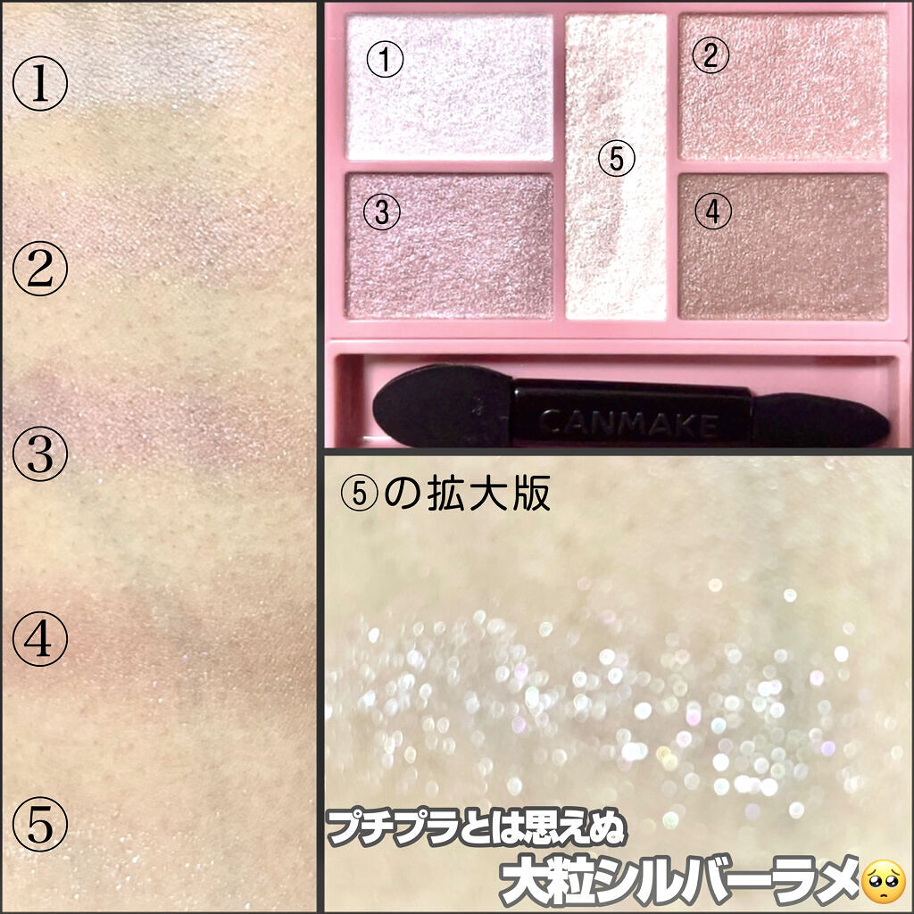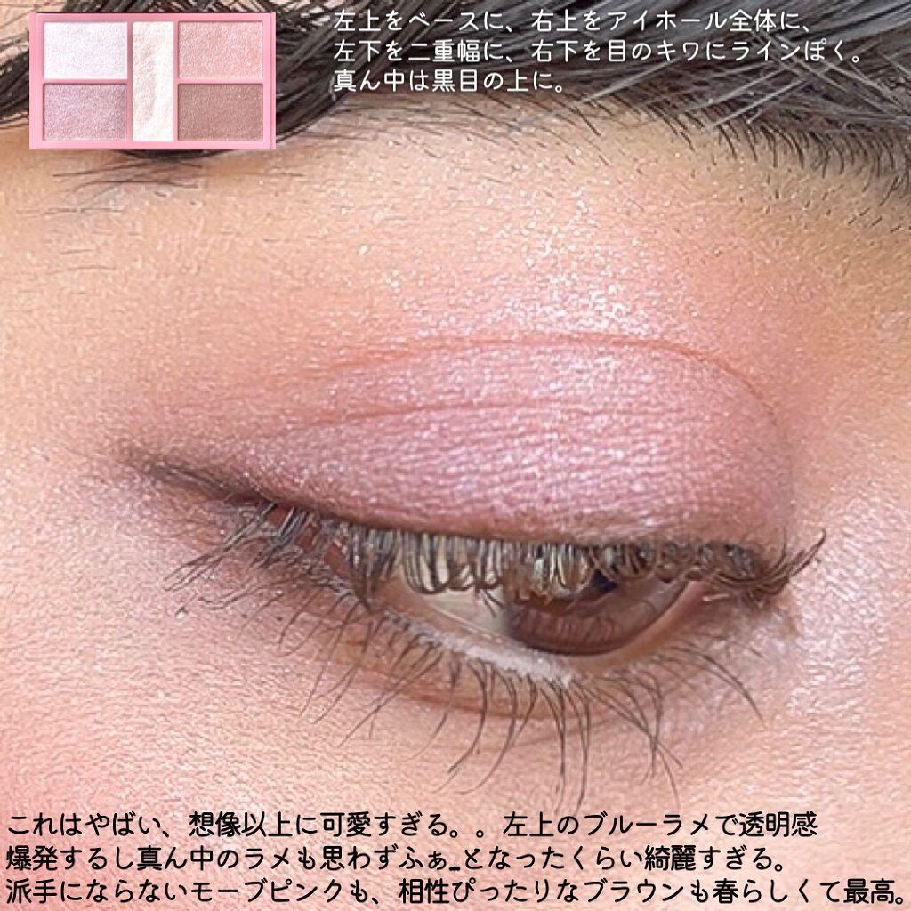 - 1枚のパレットで2つのスタイルが完成! 5色の欲ばりアイシャドウ♥ メインカラーを選んで2つのスタイルが楽しめる! A→B→D でスタイル1 A→C→D でスタイル2 繊細な粉質が、しっとりとまぶたに密着して色落ちを防ぎます。 透明感のあるキラうるトッピングジュエル(繊細ラメ)は、気分によってトッピング!