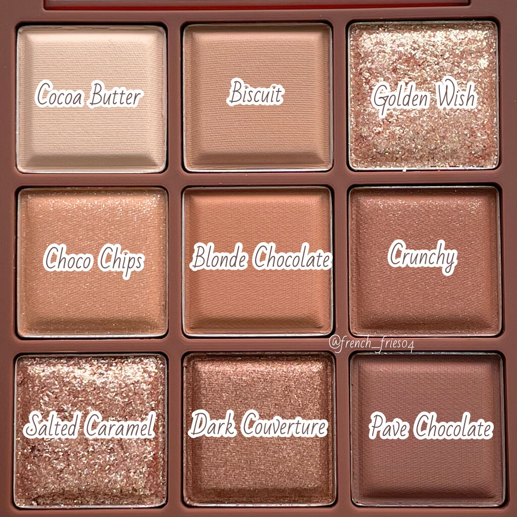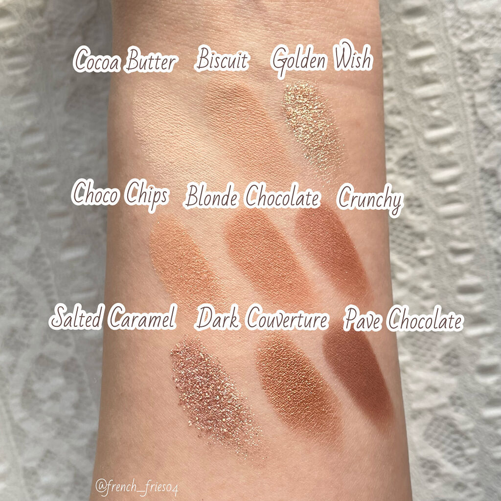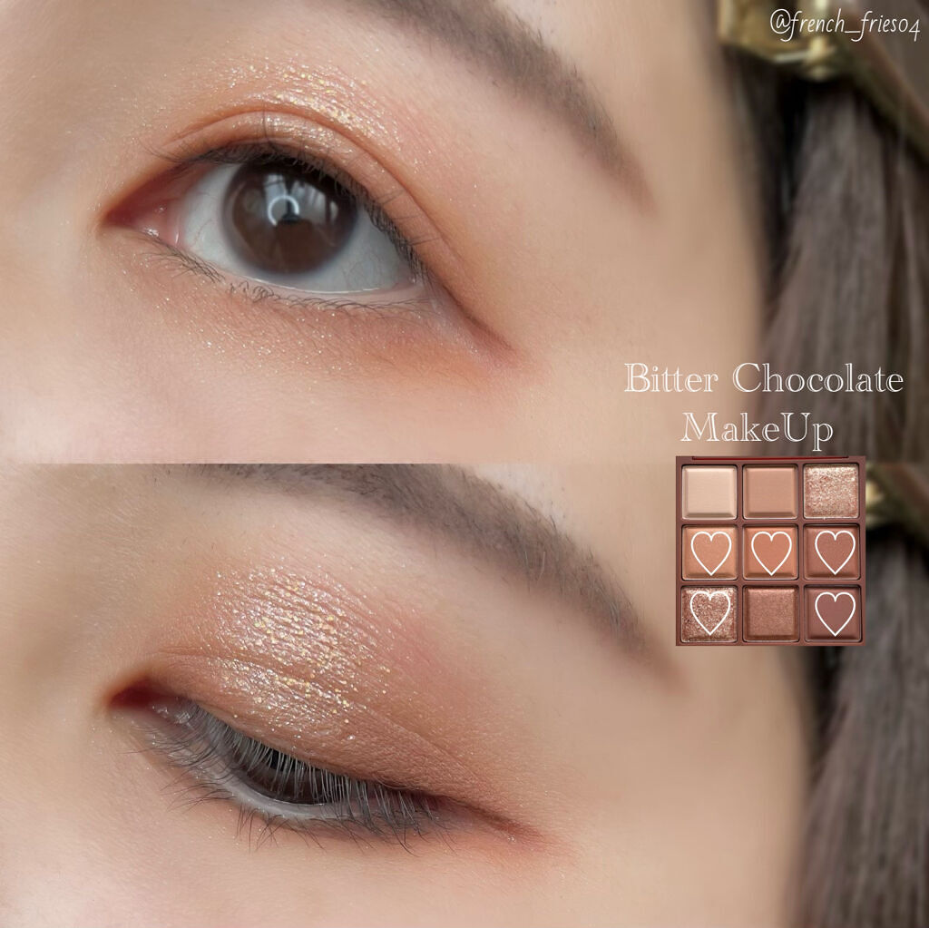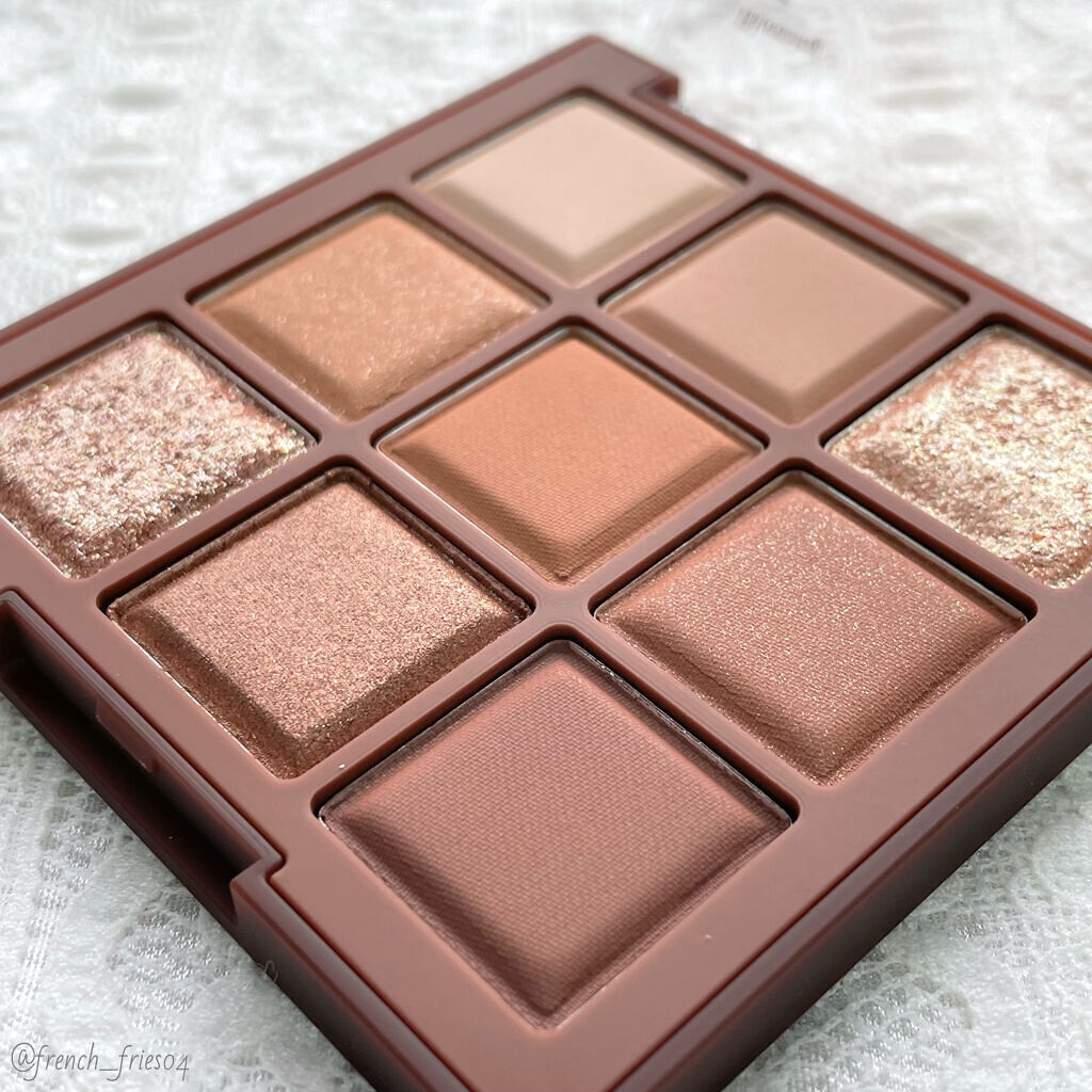 奥ゆかしいチョコレートブラウンムードを詰め込んだアイシャドウパレット🧸 色味はもちろん、アイシャドウが立体的になっていて、本物のチョコレートみたいな、見た目からして可愛い❣️ マットからラメ、グリッターまでバリエーション豊富な9色で、思いのままにアイメイクができる万能パレット🐰