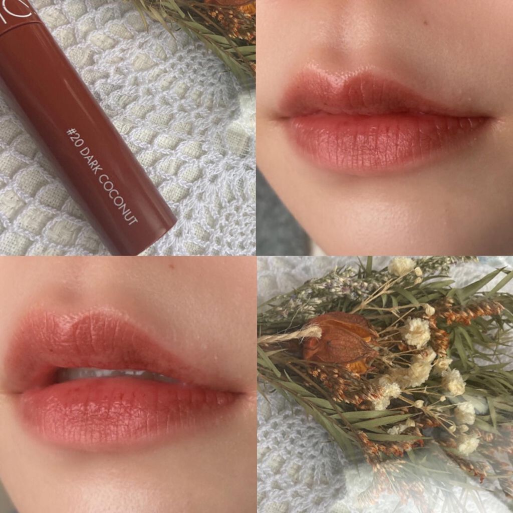 秋冬にぴったりな深みレッドブラウン🤎 #ロムアンド 「#ジューシーラスティングティント ダークココナッツ」、これが本当に可愛い…。 こっくりとしたレッドブラウンで、唇にひと塗りするだけで一気に秋っぽいおしゃれ顔に✨ 透け感のあるツヤが加わるから、重たくなりすぎず絶妙なバランス。 特にイエベ秋さんには刺さる色味! 普段メイクからちょっとしたお出かけまで、どんなシーンにも合わせやすくてヘビロテ間違いなし!