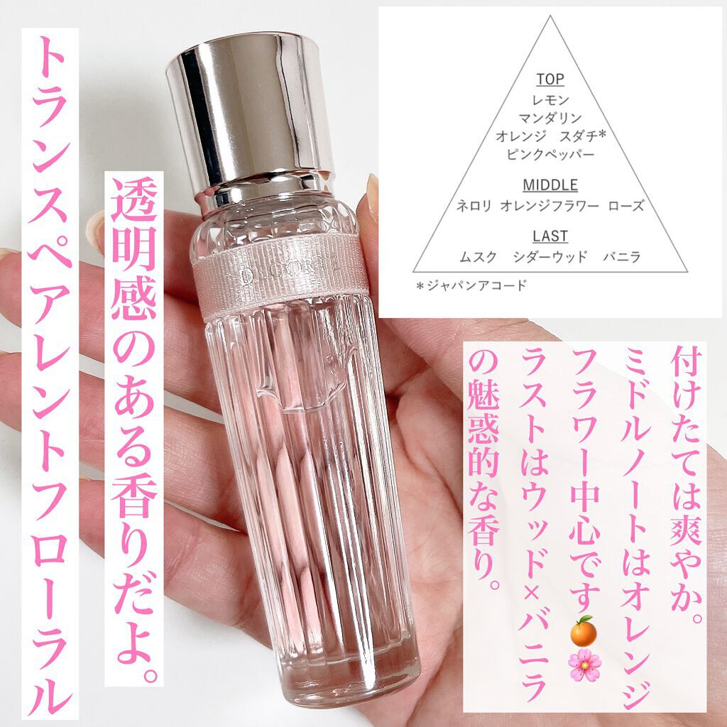 - やさしい幸福に結ばれた可憐さ 爽やかな酢橘から紡がれる透明感あるトランスペアレントフローラル 爽やかでほろ苦い酢橘(※)と軽やかなピンクペッパーではじけるようなトップノートを演出。 オレンジフラワーを中心としたブーケのようなミドルノートは透きとおる初夏の日差しのように香ります。最後にやわらかなバニラが際立つ魅惑的なウッディノートによって、やさしい幸福を包み込みます。 ※ジャパンアコード