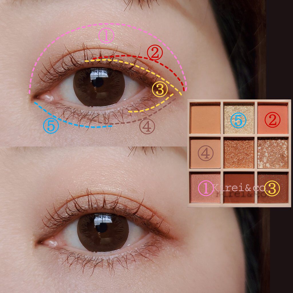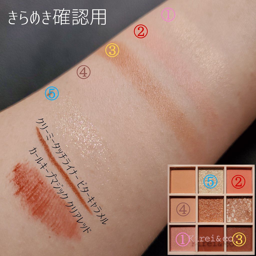 可愛い色味で、こういうカラーバランスのパレットは持っていなかったので見た目で選びました。 ほんわかした可愛らしいピンクとオレンジに、シルバーのニュアンスをプラス。うるっとした目元を演出する抜け感パレット。
