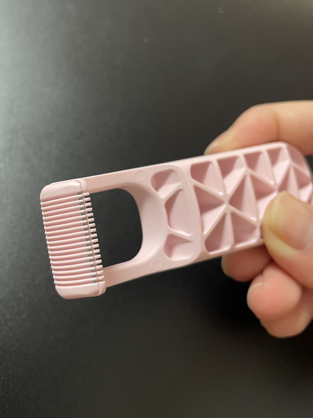 - ・POINT①窓から刃が見える「Wプロップ構造」 ヘッドとハンドルを繋ぐ支柱(プロップ)の間の 窓から、視界を確保しやすい安心設計へ。 ・POINT②多様な剃り方に対応できる「自在ハンドル」 ハンドルの表・裏・側面に指が置ける構造。 VIOゾーンの凹凸やカーブに合わせて、窓から 刃の動きを見つつ握り方を変えることで、多様 な剃り方に対応できるため、アンダーヘアを狙 い通りに処理できます。 ・POINT③刃が直接肌に触れないクシ状ガード 刃よりわずかに前に出ている細かいクシ状ガー ドが肌を守ります。VIOゾーン特有の縮れ毛や 絡まりを整えながら処理することが可能。