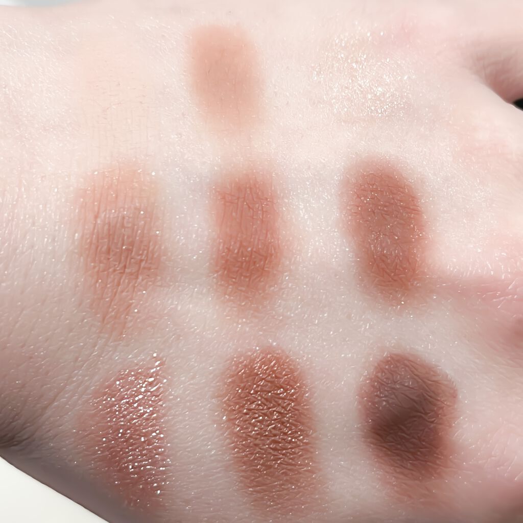 奥ゆかしいチョコレートブラウンムードを詰め込んだアイシャドウパレット🧸 色味はもちろん、アイシャドウが立体的になっていて、本物のチョコレートみたいな、見た目からして可愛い❣️ マットからラメ、グリッターまでバリエーション豊富な9色で、思いのままにアイメイクができる万能パレット🐰