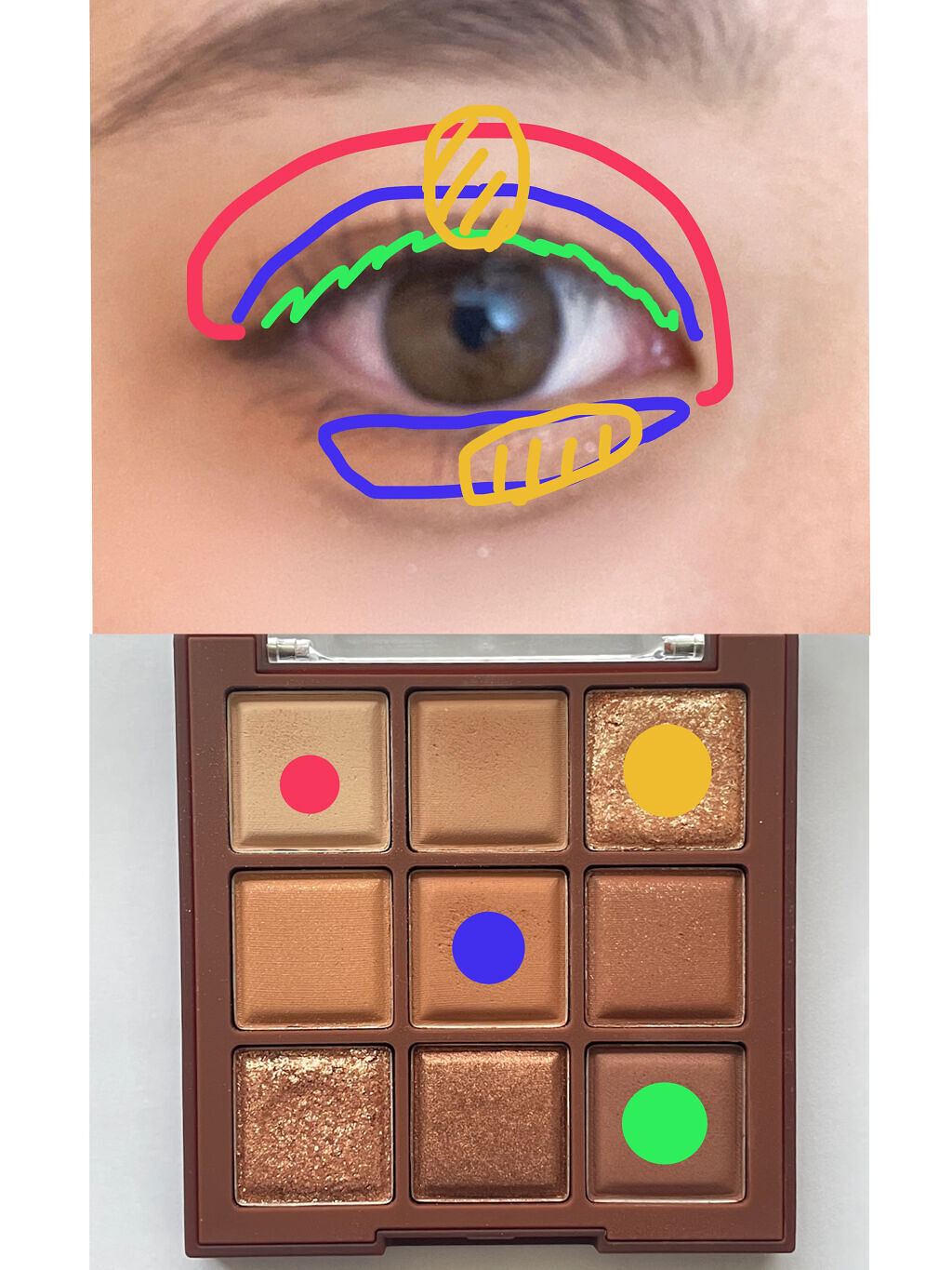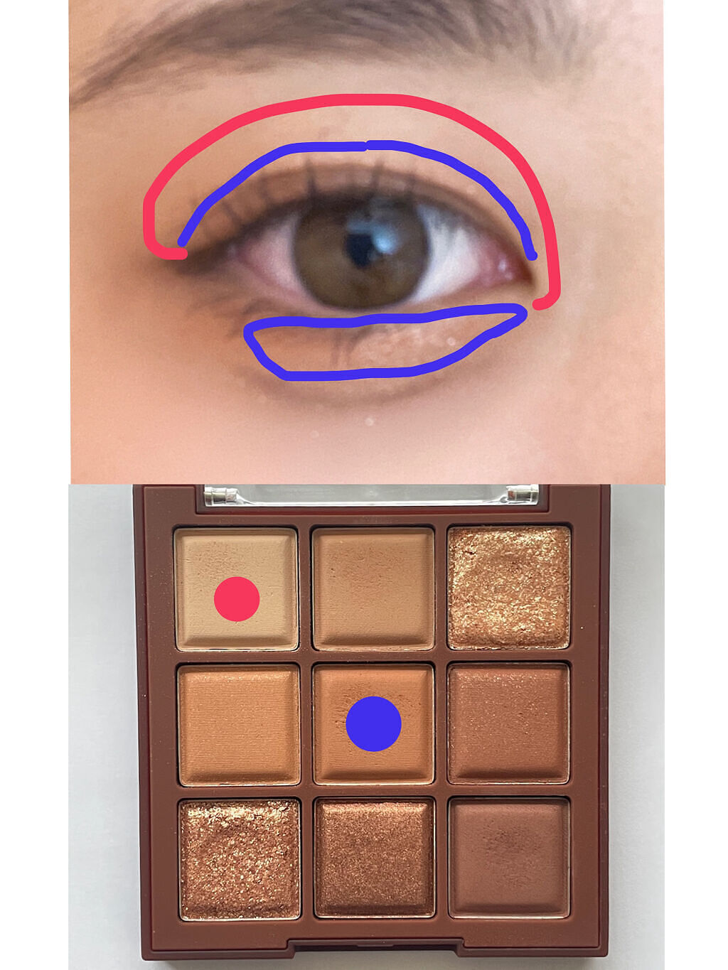 目は縦に大きく見せるために、縦割りでグラデーションしていきます! まつ毛は上下にめいいっぱい伸ばす!!! ①ベースのカラーを目全体に縦を意識して塗る ②メインとなるカラーを二重幅より少しはみ出るくらいに縦を意識して塗る ③濃い色を目の際と涙袋に塗る 涙袋は真ん中が1番下になるように、丸っぽく書く ラメを涙袋と黒目の上にのせる 黒目の上は二重幅よりも少し上になる方が目を開けた時もラメが見えて目が明るく見える アイラインを目の延長線にかく、跳ねない! まつ毛を長く長くする!