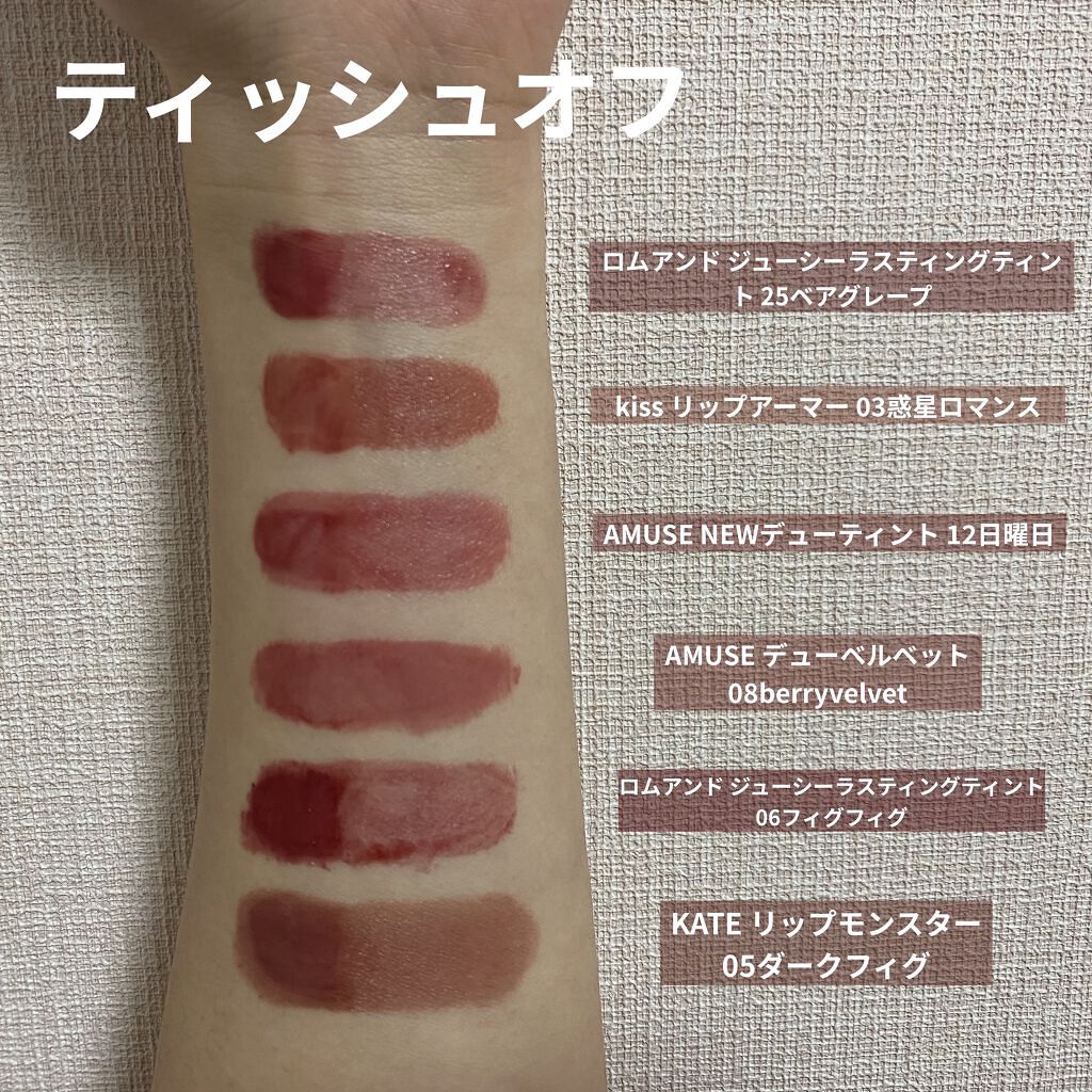 実際は写真より青みがあります。 塗ってみると色味が可愛くてブルベのMLBB、元からこの色の美少女になれます。 ロムアンドジューシーラスティングティント025ベアグレープに似てます! ブランドPRにもありますが塗って数分放置するとジェル膜が形成されるそうです。 実際に透明のツヤ膜が張られて触っても色移りしないのと私は荒れなかったので早くも1軍リップ入りしました!!