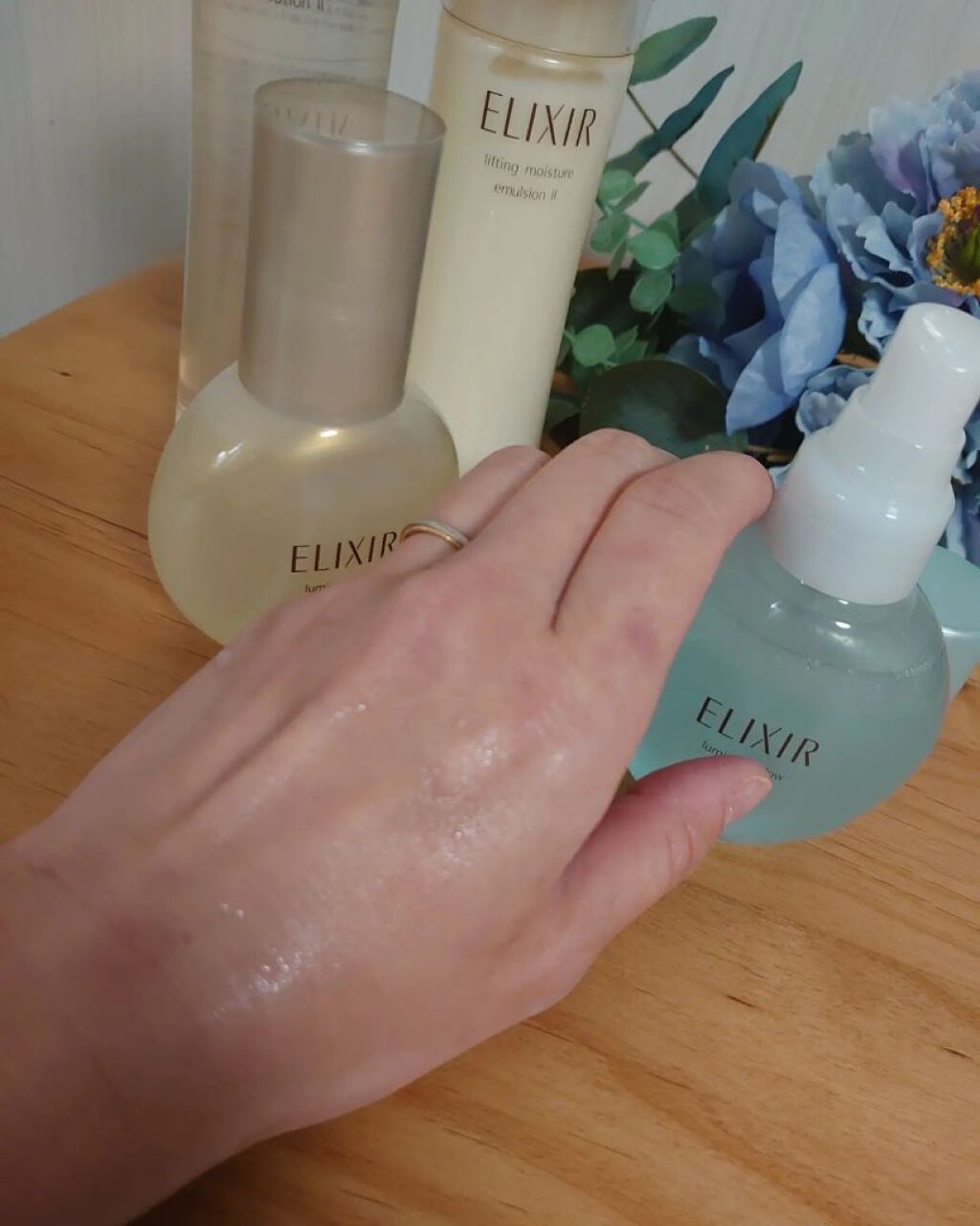 - エリクシール エイジングケア※5 メイクの上から素肌に届く。瞬時に「つや玉」。 ※5 エイジングケアとは、年齢に応じたうるおいケアです。 ○きめ細かいミストが、メイクの上からも、たっぷりのうるおいとなめらかで均一なハリを与え、瞬時に「つや玉」が輝く肌へ -厳選成分 クレソンエキスBG オランダカラシエキス、1,3-ブチレングリコール(保湿) -独自成分 イノシトールCP イノシット、酵母エキス(3)、グリセリン(保湿) -コラーゲンGL高濃度配合※6 ※6 エリクシールシュペリエル シリーズ比 水溶性コラーゲン、グリセリン(保湿) ○美容水層と美容オイル層が混ざり合い、メイクを崩さず肌のすみずみまでうるおいで満たします ○明るくリフレッシュした気分を演出する、みずみずしいフローラルの香り ○アレルギーテスト済み (全てのかたにアレルギーが起きないというわけではありません。)