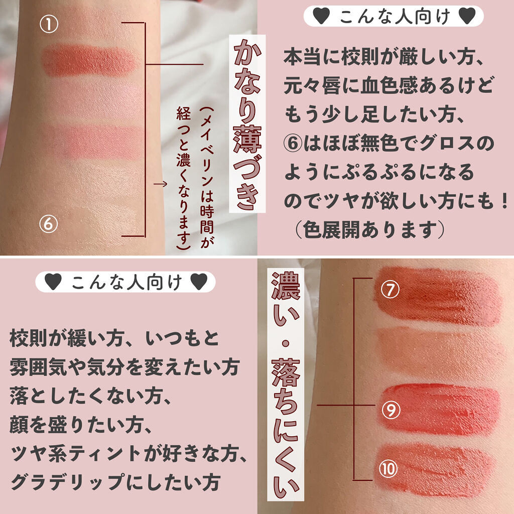 | リップティントランキング第68位 | 唇にピタッと密着しているような感じがあり、なじみが良い 1度塗りだと薄づきでナチュラルな発色になり、塗り重ねていくとしっかり発色して可愛い | 詳細を見る | |