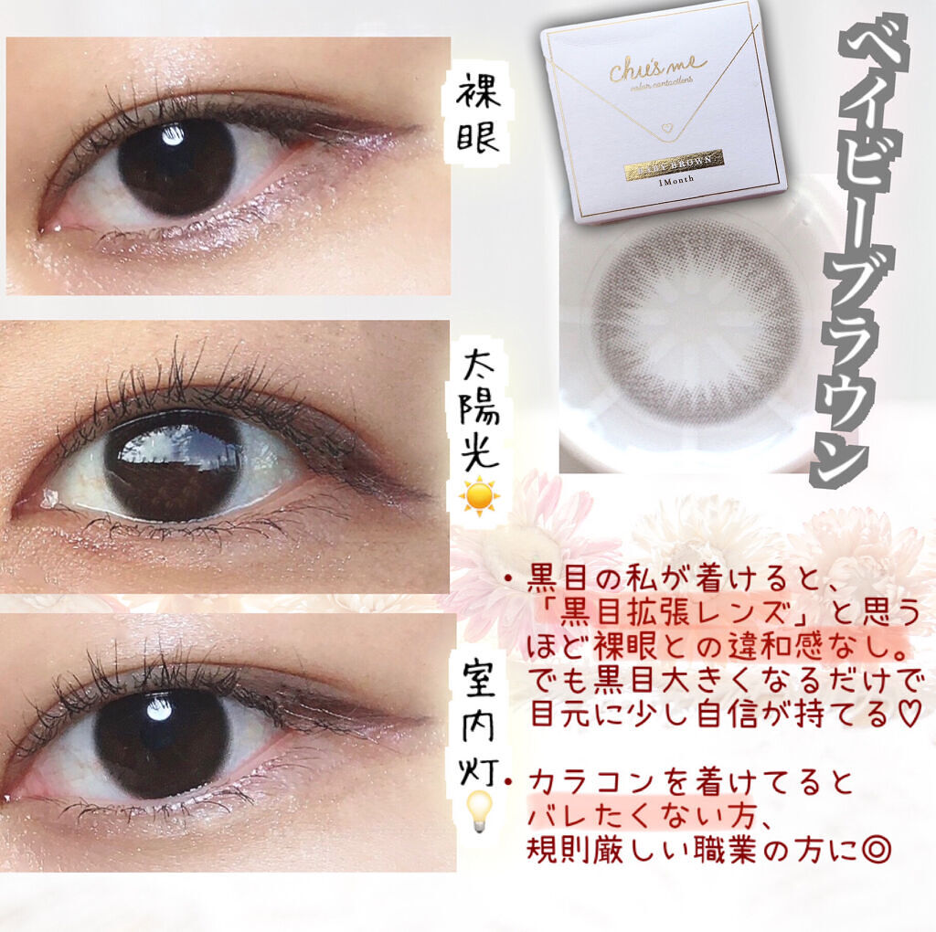 ベイビーブラウンで物足りなかった人へ〝ベイビーモア♥️〟Chu'smeのベイビーブラウンは裸眼っぽい感じだったけどあまりに裸眼っぽくナチュラルすぎて盛れなかったベイビーモアはそのナチュラルさを残しつつ着色直径が大きくなった!近くでみてもカラコ...