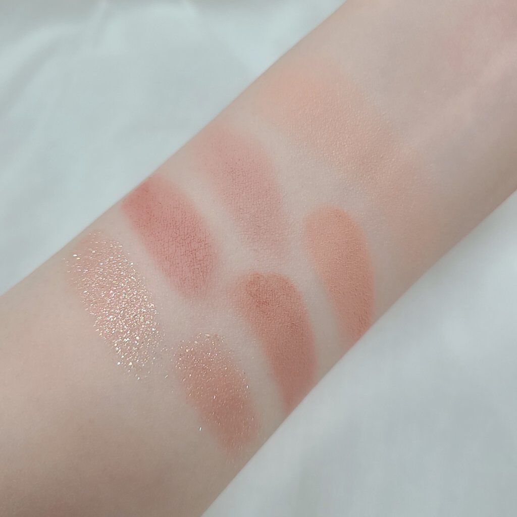 どちらも粉飛びすることはないけど、わりと軽い粉質なので目元に塗るときはアイシャドウベースを塗った方がいいかも? マルチパレットだからこれ1つでアイシャドウ、チーク、ハイライト完成します☺️ 白みピンクはわりと発色柔らかめなのでチークに使えそう!粒々の集合体はわりと濡れ感のあるラメでお気に入りになりました✨ 全体的に色味が少ない印象なので、儚げなメイクに合いそうですね😃💕 本当はヌーディーピンクが本命だったのですが、実際届いたら、ついでに買ったこちらのアッシュピンクの方が気に入ってしまいました笑 色味も捨て色がないし、何よりラメが大優勝でした! ヌーディーピンクの粒々と同じ位置にあるおラメさん。。。可愛すぎます。。。 ヌーディーピンクのラメと同じく濡れ感のあるテクスチャーです! パレットだとシルバーっぽいラメだと感じるのですが、実際腕に出してみるとベースが少しくすんだピンク味のある淡いブラウンなんです! 動画のスウォッチを見ていただくとわかると思うのですが、密着度高めでラメの輝き方も綺麗でした😭