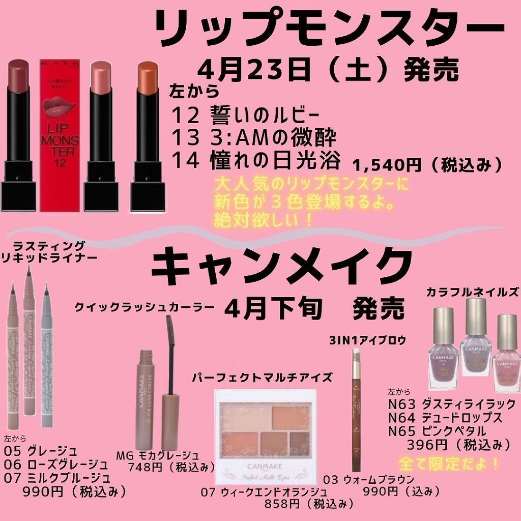 エクセル2022年11月15日(火)発売 デイジードール2022年11月18日(金)発売 マジョリカマジョルカ2022年11月21日(月)発売 リリミュウ2022年11月21日(月)発売 キャンメイク2022年11月30日(水)発売 ヴィセ&ヴィセリシェ2022年12月1日(木)発売 セザンヌ2022年12月上旬発売 リップモンスター2022年11月&12月発売11月19日(土)発売👉ミニサイズ(既存2色)12月17(土)発売👉限定2色