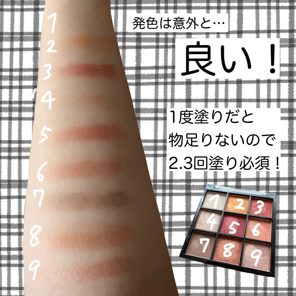発色はナチュラルでとても可愛いです このお値段でこのクオリティはすごいと思いました。 🥜01ナッツベージュザ・ベージュって感じのカラー締め色を加えることで立体感ある目元になります。右上がパール左下がマットしめ色はほんのり艶感のあるマット。個人的にはマットが可愛いです 02ロージーベージュブルベ向けかなと思ったけどイエベでも使えそうピンクーって感じはないので誰でも使いやすいです! 📎おすすめの使い方📎ブラシで塗る際は、柔らかめのブラシをお勧めします!ふわりと発色してくれるので可愛いです。 硬いのだとポロポロ出るし発色もイマイチ。 あと、左上のラメを使わないー!このラメがあまり綺麗に見せてくれないのでラメなしでも可愛いのでぜひ!! 使い方を工夫すれば全然使えます!!